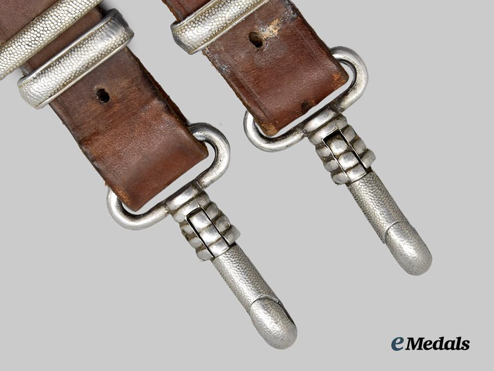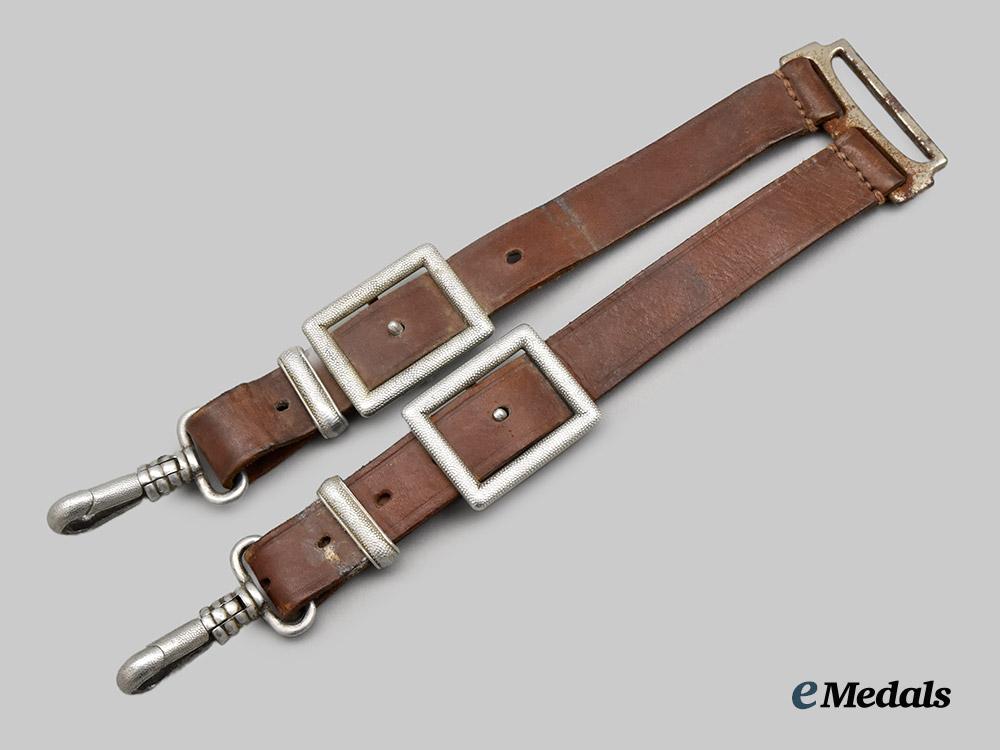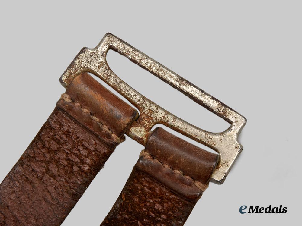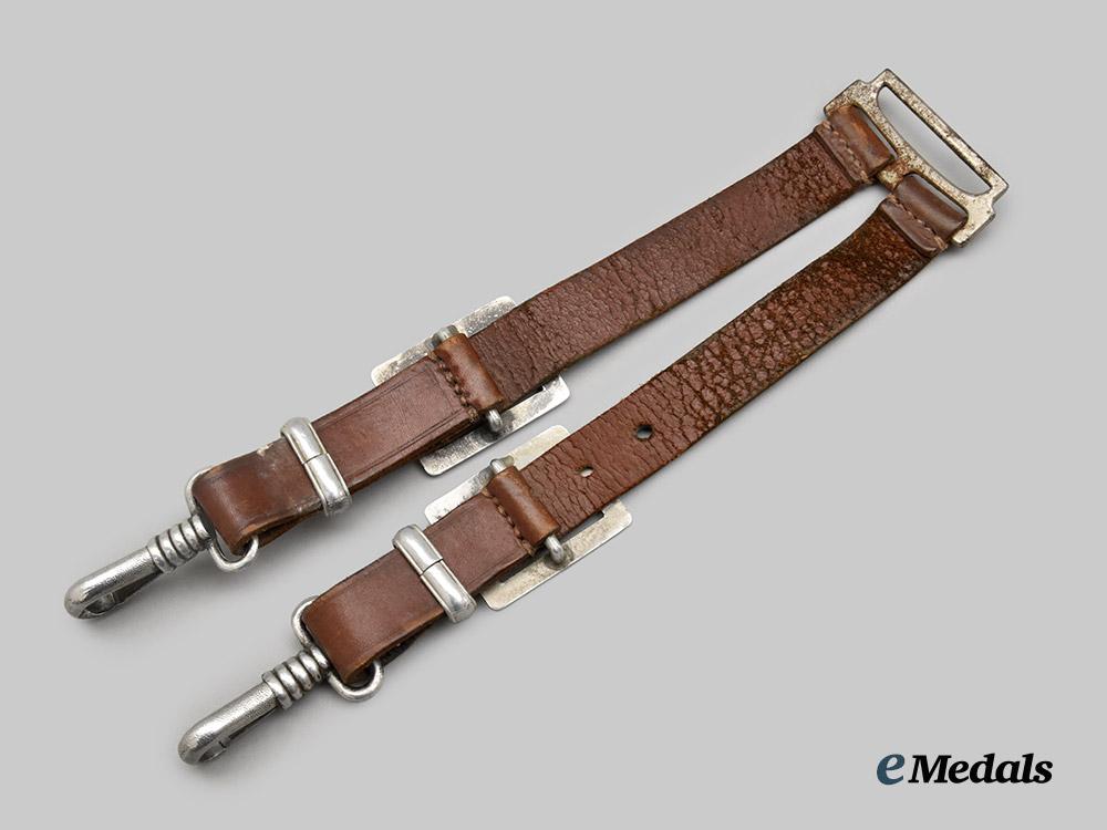 (Reichsarbeitsdienst Gehänge für Offiziersdolch). A Reichsarbeitsdienst (Reich Labour Service/RAD) Officer’s dagger hanger, consisting of a magnetic steel loop with two additional loops emanating from the lower edge, the latter accommodating two brown leather straps adjusted with dual rectangular aluminum buckles with prongs meeting five eyelets sets into the straps, each culminating in a functional aluminum spring clip, unmarked, measuring 23.5 cm in total length as presented, demonstrating minor oxidation and material fatigue to the steel and leather elements, respectively, a scarce hanger in near extremely fine condition.