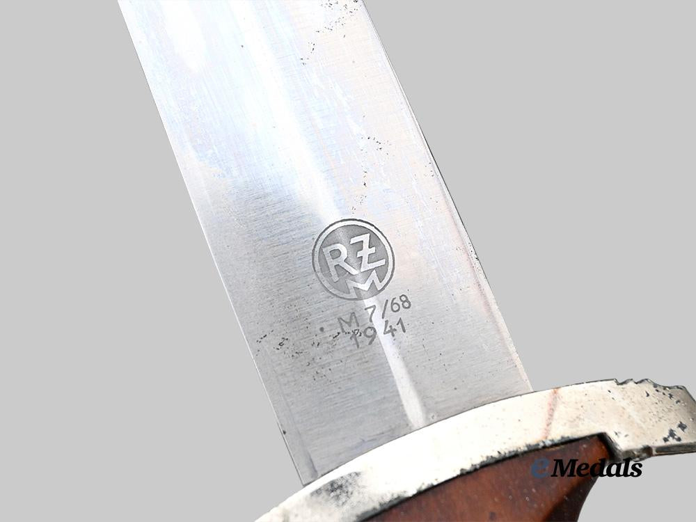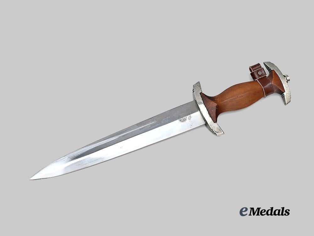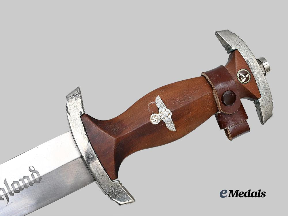 (Sturmabteilung Dienstdolch M33). A well-preserved Sturmabteilung (SA) Model 1933 Service Dagger, measuring 37 cm in total length when inserted into the scabbard. It features a 22 cm-long, nickel-plated, magnetic steel blade which retains factory-original sharpening to both the edges and tip, and with most of its original crossgrain still visible. Acid-etched onto the obverse of the blade is an inscription of “ALLES FÜR DEUTSCHLAND” (“EVERYTHING FOR GERMANY”) in Fraktur script. The reverse ricasso is marked with a Reichszeugmeisterei (RZM) logo and maker code “M7/68”, indicating manufacture by Lauterjung & Co., Solingen, in turn situated above a manufacture date of “1941”. The blade sits securely within a nickel-plated alloy upper crossguard which is marked with eight notches, distributed in groups of four at both the top and bottom. The handle grip is composed of a single piece of lacquered dark brown wood which is carved into a curvature for a comfortable grip. Inset into the obverse of the handle is a silvered German national eagle clutching a wreathed mobile swastika, measuring 25 mm (w) x 15 mm (h). Also inset into the obverse of the pommel is a partially-silvered SA insignia measuring 9 mm in diameter. The dagger culminates in a nickel-plated alloy lower crossguard, similarly marked with eight notches, which retains a rounded pommel nut to maintain the dagger’s structural integrity. Accompanying the dagger is its original scabbard, constructed of a brown painted magnetic metal shaft. Nickel plated magnetic metal fixtures are secured to both the tip and throat, with the latter featuring a loop for the accommodation of a hanger, which is included and consists of a brown leather connecting to a functional metal spring clip which is maker marked with the logo of F.W. Assmann & Söhne, Solingen, along with an RZM logo and maker code of “M5/8” for the same manufacturer. The strap is also marked with an RZM logo and code “L2/371/39”, which is attributed to E.G. Leuner, Bautzen. A functional catch within the throat firmly holds the knife in place during storage. Minor issues consistent with age and wear are evident, and include some running mark to the blade, sporadic loss of nickel plating and paint to the plated fixtures and scabbard shaft, respectively, and minor wear to the hanger’s leather strap. This dagger, which remains in an exceptional state of preservation for a late-issue example, remains in an extremely fine condition.