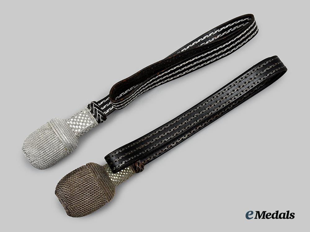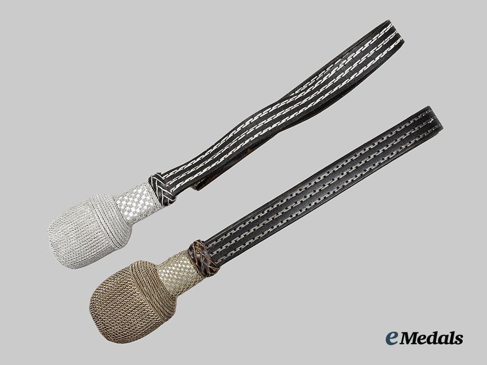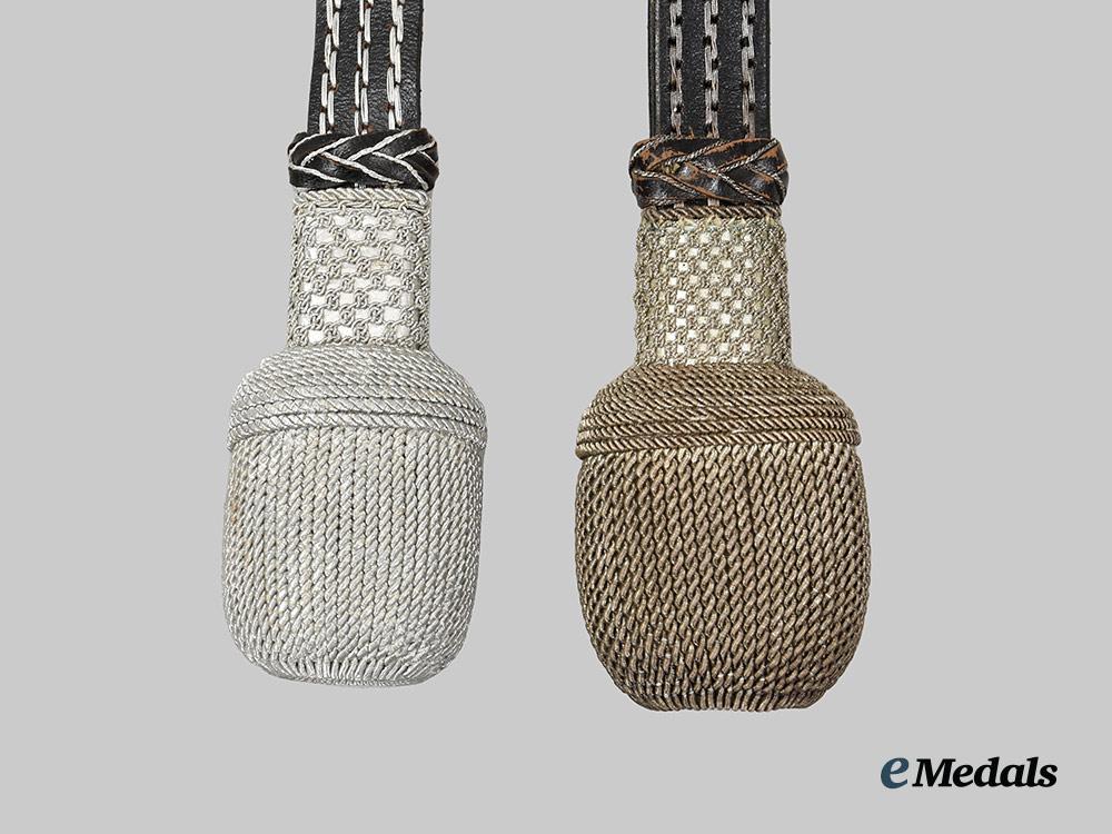 A lot of two Wehrmacht (Heer) dagger portepee, consisting of a stylized silver aluminum wire acorn, topped by a silver threaded cupule, emanating from a non-magnetic metal stem which in turn connects to a silver aluminum wire cord trimmed along both edges with machine-embroidered black tresses, unmarked, in near better than very fine condition.