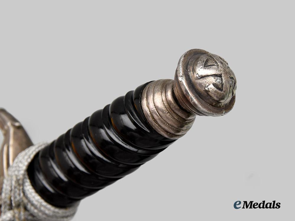 (Bahnschutz Dolch für Führer, 2. Model mit Gehänge). A rare and well-preserved Bahnschutz Official’s dagger, measuring 40.5 cm in total length when inserted into the scabbard. It features a 26 cm-long, nickel-plated, magnetic steel blade with a sharpened tip and edges. It is plain with the exception of a maker’s mark on the reverse ricasso of “ORIGINAL EICKHORN, SOLINGEN”, circumscribing the firm’s classic logo of squirrel clutching a sword. The blade sits securely within a nickel-plated alloy crossguard, the obverse of which bears a Reichsbahn insignia in the form of a winged wheelset, with the seam covered by an intact black leather buffer pad. The handle grip is composed of a single piece of ribbed black celluloid, and the dagger completes with a nickel-plated pommel bearing a raised sunwheel-style swastika, screwing in to maintain the dagger’s structural integrity. Wrapped around the handle is a matching portepee, consisting of a stylized silver aluminum wire acorn suspended from a strap of identical construction, interspersed with black stripes. It is accompanied by its original scabbard, constructed of a magnetic metal shaft. The upper third of the shaft has two integral ribbed bands retaining loops for the accommodation of a hanger. A functional catch situated within the throat firmly holds the dagger in place during storage. Minor issues consistent with age and wear are evident, and include some running marks to the blade, some blunting of the tip, and sporadic scratching and chipping of the nickel plating to the applicable fixtures. This scarce example remains in a near extremely fine condition.