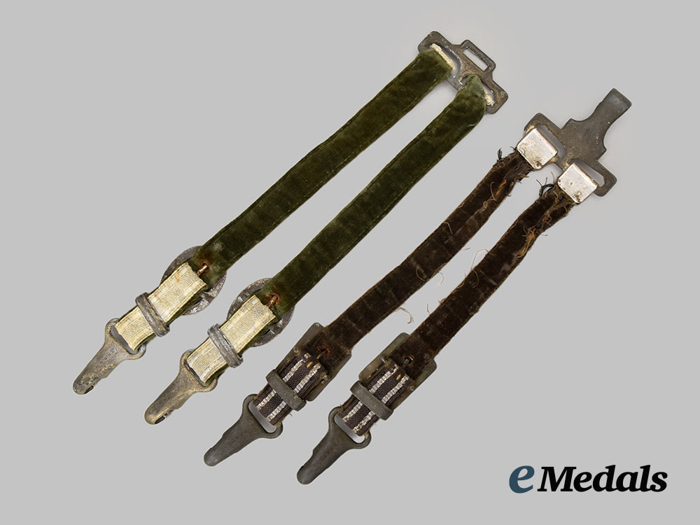 2. One Luftwaffe issue, consisting of a partially-functional zink and magnetic metal spring clip, with two loops emanating from the bottom edge, each retaining a slate-grey doekins strap topped by slate-grey machine-embroidered tresses flanked by silver alumium wire piping, both retaining functional silvered zink buckles and culminating in functional silvered zink spring clips, unmarked, measuring 28 cm in length, demonstrating material fatigue to the embroidered features in addition to loss of finish throughout the zink fixtures, in very fine condition.