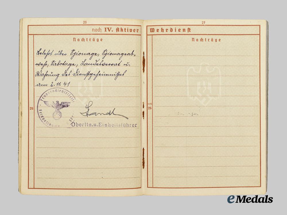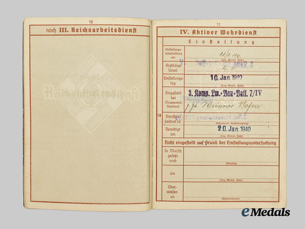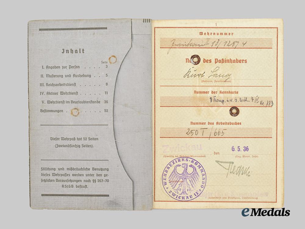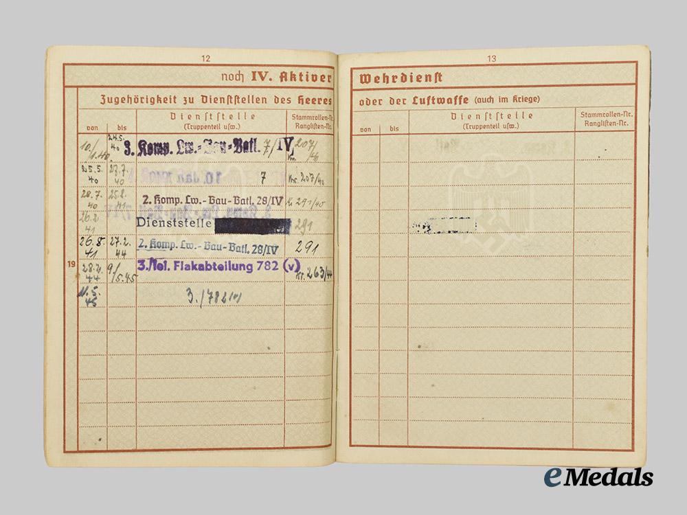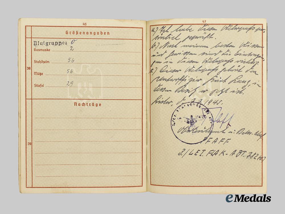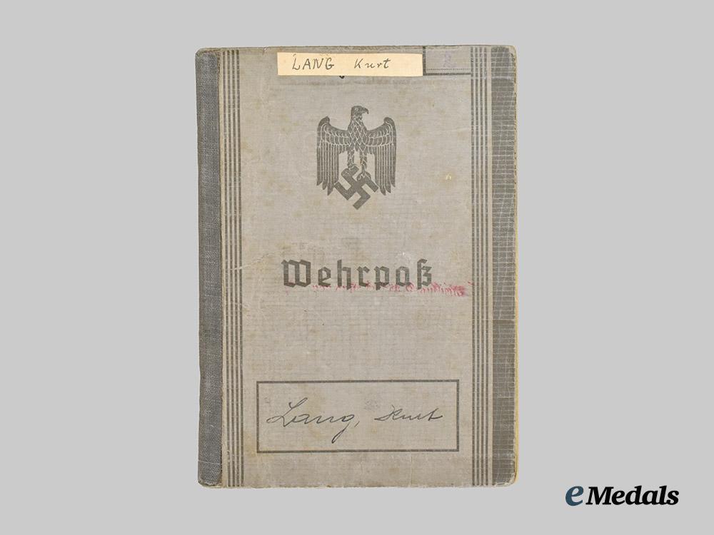 (Luftwaffe Wehrpaß). Constructed of a card stock binding with 52 paginated interior pages with filled handwritten and stamped entries, named to “KURT LANG”, who saw service with the Luftwaffe on construction and flak duties, primarily in Norway, retaining a certified studio portrait of Lang, also including a French-issue prisoner-of-war form and wartime obituary for his brother, Helmut, also a Luftwaffe servieman who died on 31 March 1944, the Wehrpass measuring 10.5 cm (w) x 15 cm (h), demonstrating minor and age-appropriate material fatigue, in near extremely fine condition.