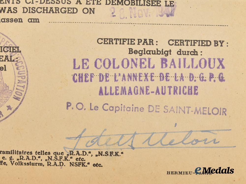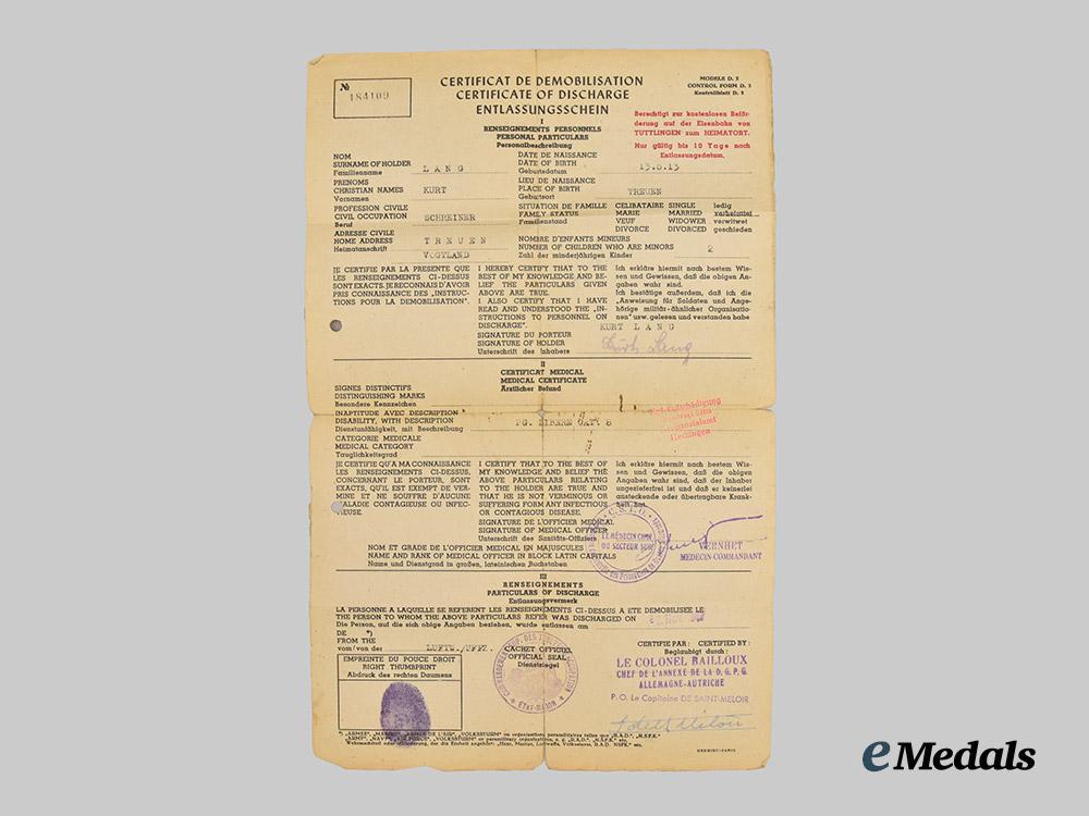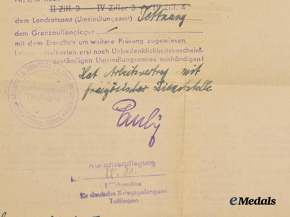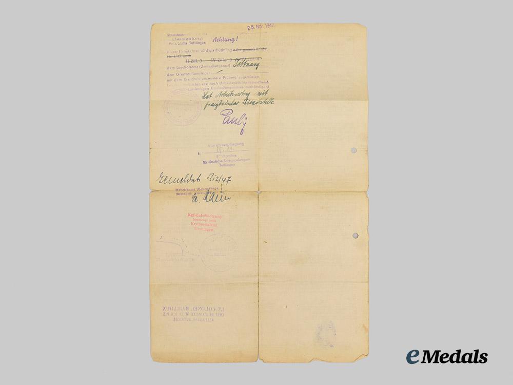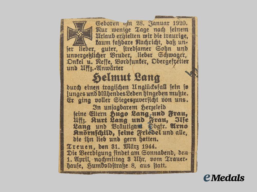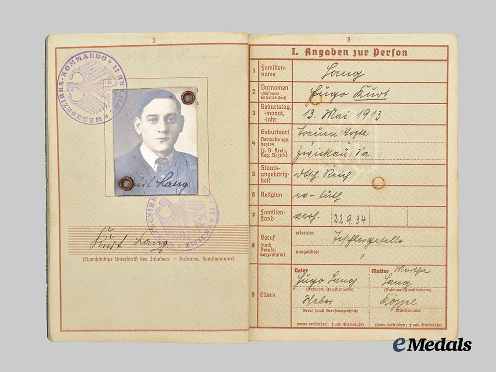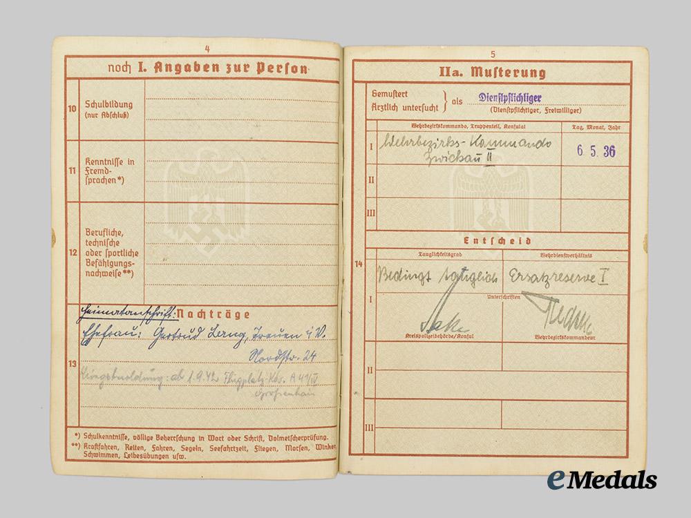(Luftwaffe Wehrpaß). Constructed of a card stock binding with 52 paginated interior pages with filled handwritten and stamped entries, named to “KURT LANG”, who saw service with the Luftwaffe on construction and flak duties, primarily in Norway, retaining a certified studio portrait of Lang, also including a French-issue prisoner-of-war form and wartime obituary for his brother, Helmut, also a Luftwaffe servieman who died on 31 March 1944, the Wehrpass measuring 10.5 cm (w) x 15 cm (h), demonstrating minor and age-appropriate material fatigue, in near extremely fine condition.