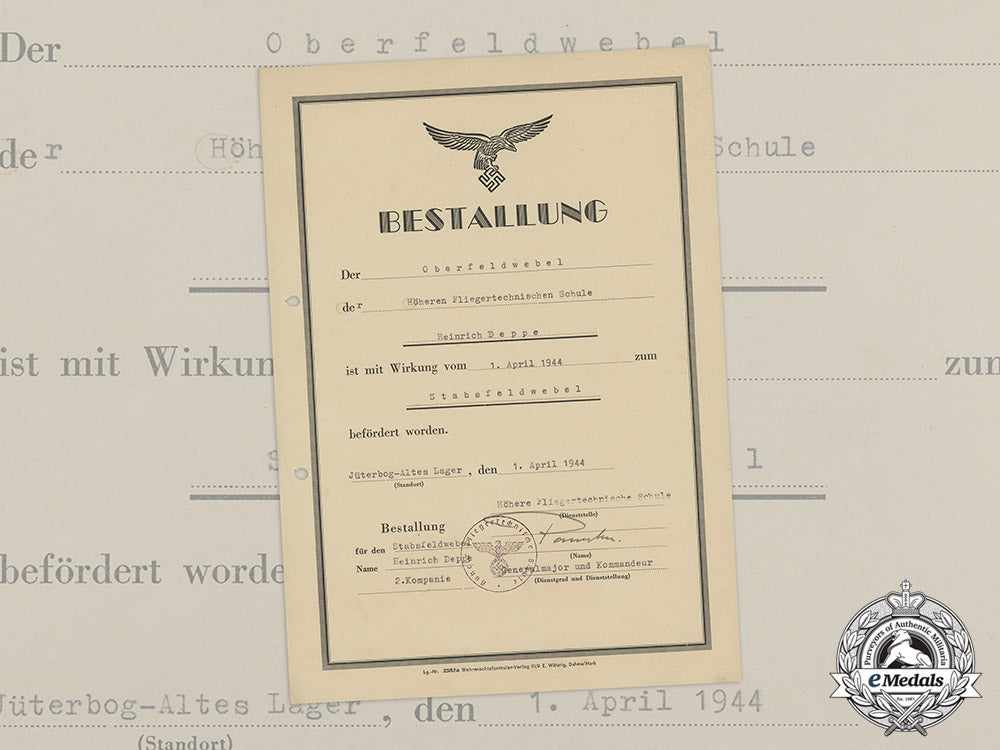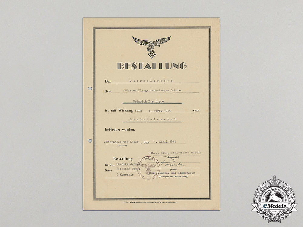 A 1944 Promotion Document To Luftwaffe Stabsfeldwebel Heinrich Deppe