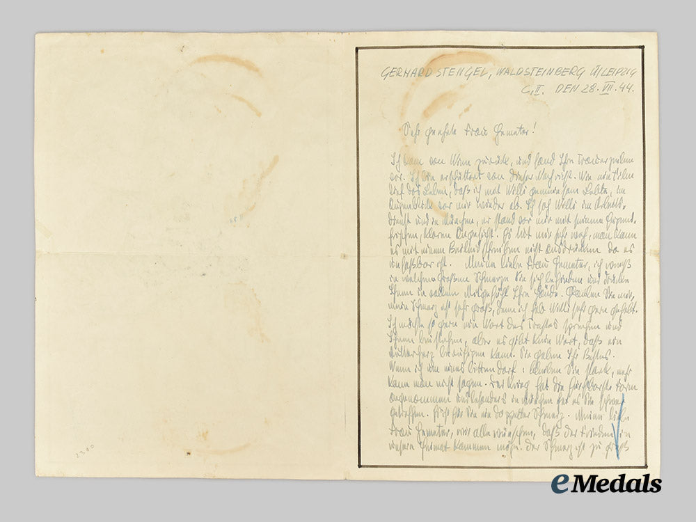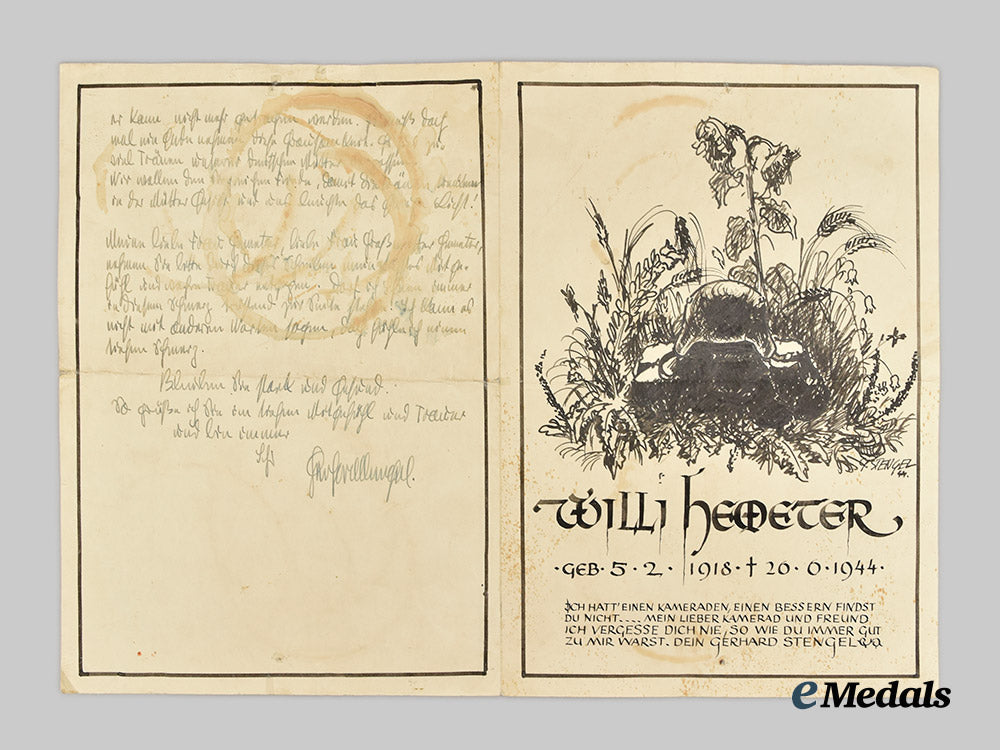 5. A handcrafted memorial letter to Hemeter’s mother from Gerhard Stengel, constructed of off-white paper stock with black ink, the cover bearing a black ink sketched memorial with Hemeter’s name and dates of birth and death, followed by an excerpt of lyrics from “Ich hatt’ einen Kameraden”, in turn followed by a length handwritten letter, dated 28 July 1944, measuring 21 cm (w) x 30 mm (h), demonstrating soiling and a folding line, an interesting tribute in very fine condition.