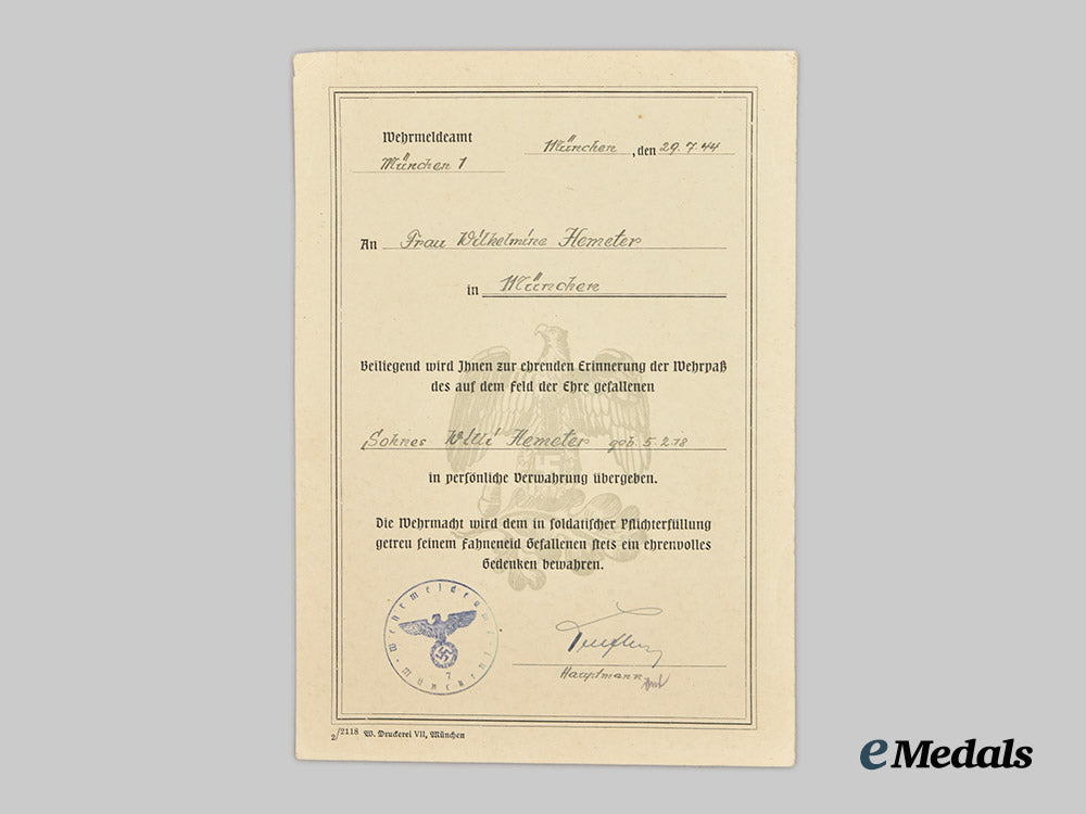 4. A cancellation pass for Hemeter’s Wehrpass which has been returned to his mother, Wilhelmine Hemeter, a resident of Munich, dated 29 July 1944 and certified by the handwritten signature of an unidentified Hauptmann, measuring 15 cm (w) x 21 cm (h), in extremely fine condition.