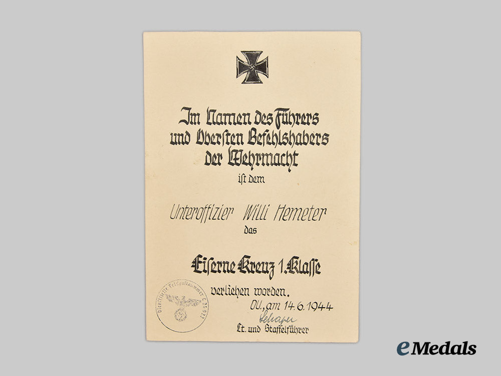 3. A unique field-made award document for the 1939 Iron Cross I Class, constructed of off-white paper stock with hand-written black ink, named to Hemeter as an Unteroffizier, dated 14 June 1944 and certified by the handwritten signature of an unidentified Leutnant and Squadron Commander of Aufklärungsstaffel 3. (F), the reverse bearing a handwritten addendum indicating that the document is a replacement for Hemeter’s original example which was destroyed during enemy actions, dated 21 December 1944, measuring 14 cm (w) x 20 cm (h), a rare and fascinating example in extremely fine condition.