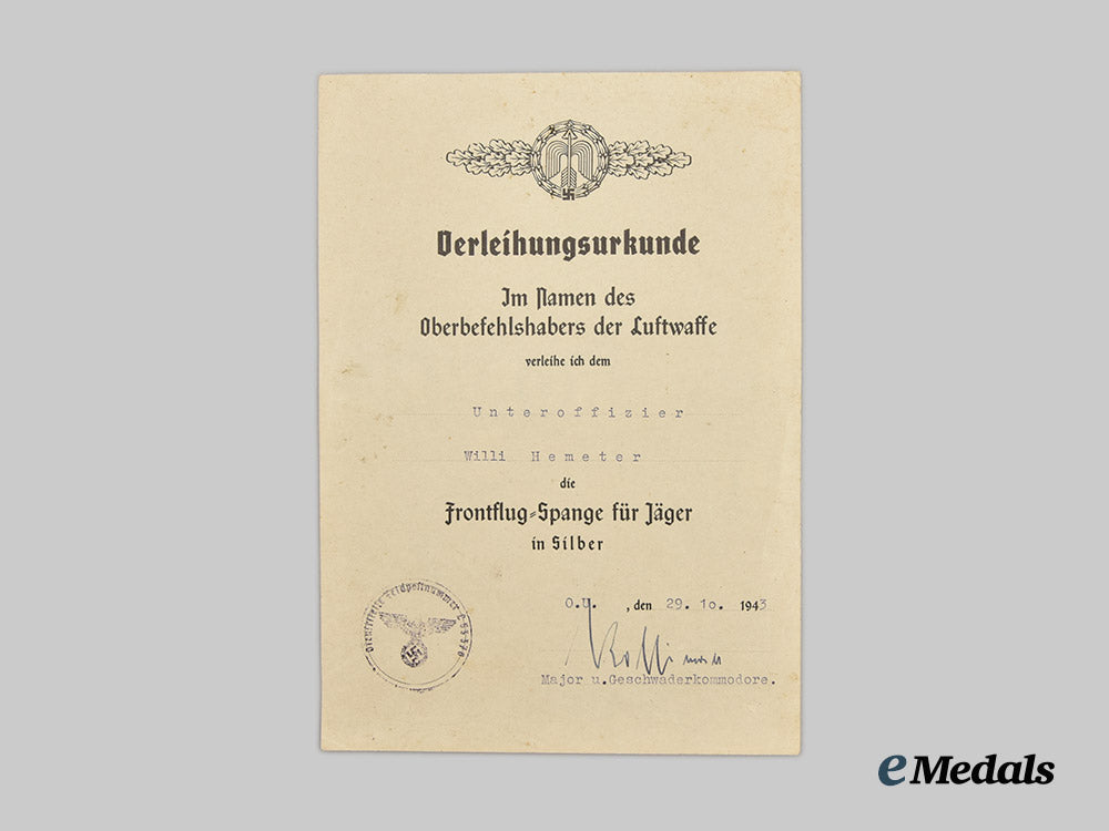 2. One for the Luftwaffe Fighter Clasp, Silver Grade, named to Hemeter as an Unteroffizier, dated 29 October 1943 and certified by the handwritten signature of an unidentified Major and Wing Commander, measuring 15 cm (w) x 21 cm (h), in near extremely fine condition.