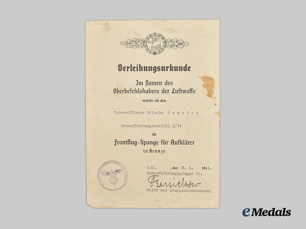 1. One for Luftwaffe Reconnaissance Clasp, Bronze Grade, named to Hemeter as an Unteroffizier of Nahaufklärngsstaffel 3/11, dated 8 June 1943 and certified by the handwritten signature of Major Horst Barsikow, measuring 15 cm (w) x 21.5 cm (h), demonstrating minor soiling and a single folding line, in better than very fine condition.