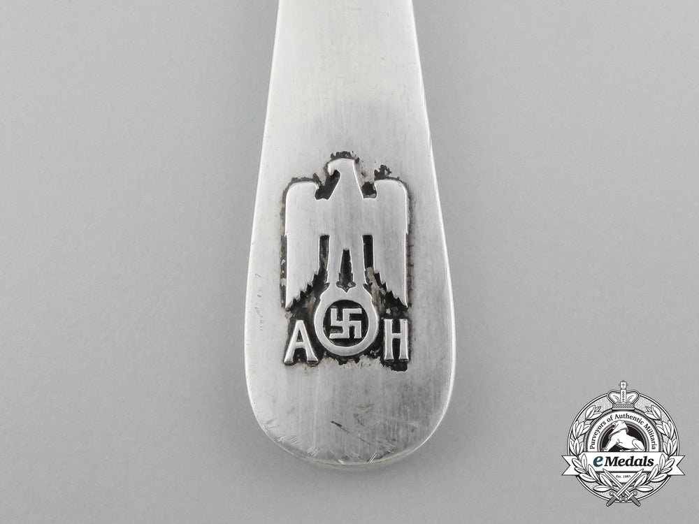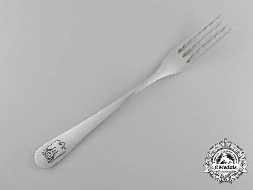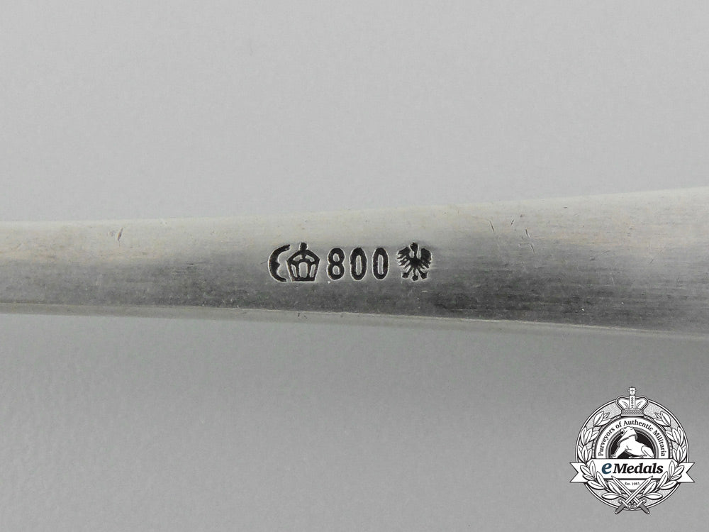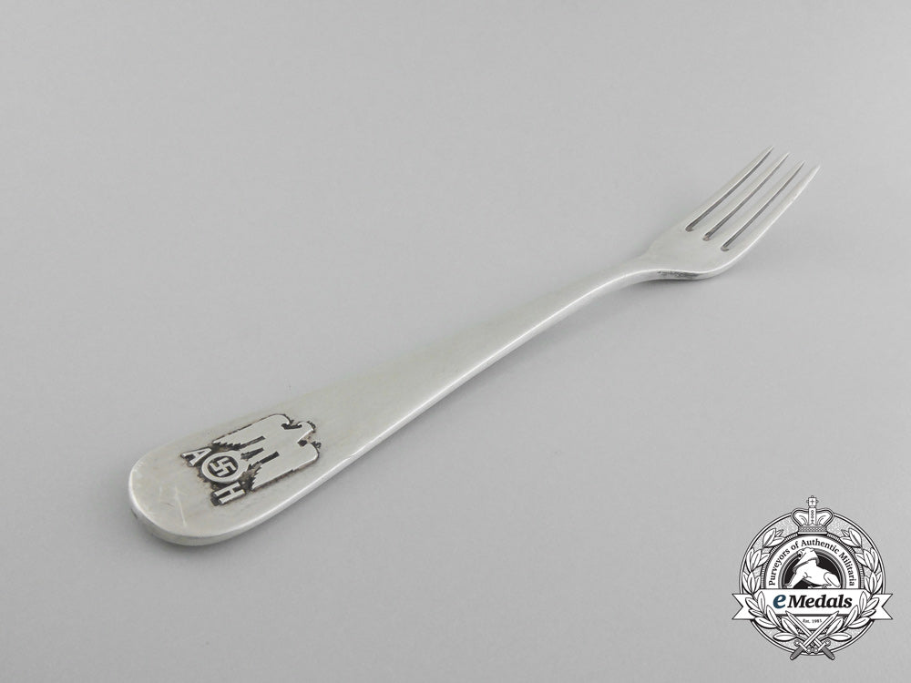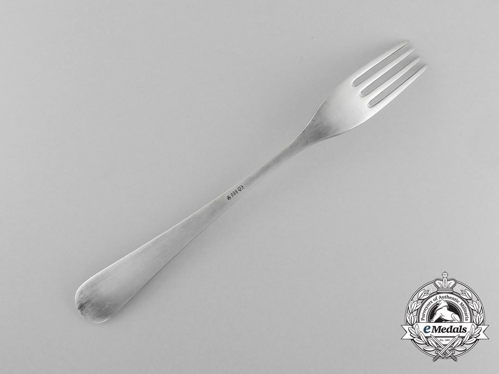 This is an exceptional find and most certainly a rare piece. This is an oyster fork that was placed at a semi-formal dinner or lunch for an honoured guest. The fork features a left facing national eagle as shown on the formal-pattern pieces, with the Führer’s initials “A.H.” on each side of the wreath. The reverse bears the hallmark of Bruckmann’s crescent moon, “800” for the silver content, as well as Bruckmann’s personal Prussian eagle. The fork has four prongs and measures 145 mm x 15 mm, has been thoroughly cleaned, and is in overall exceptional condition.