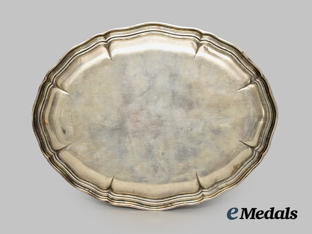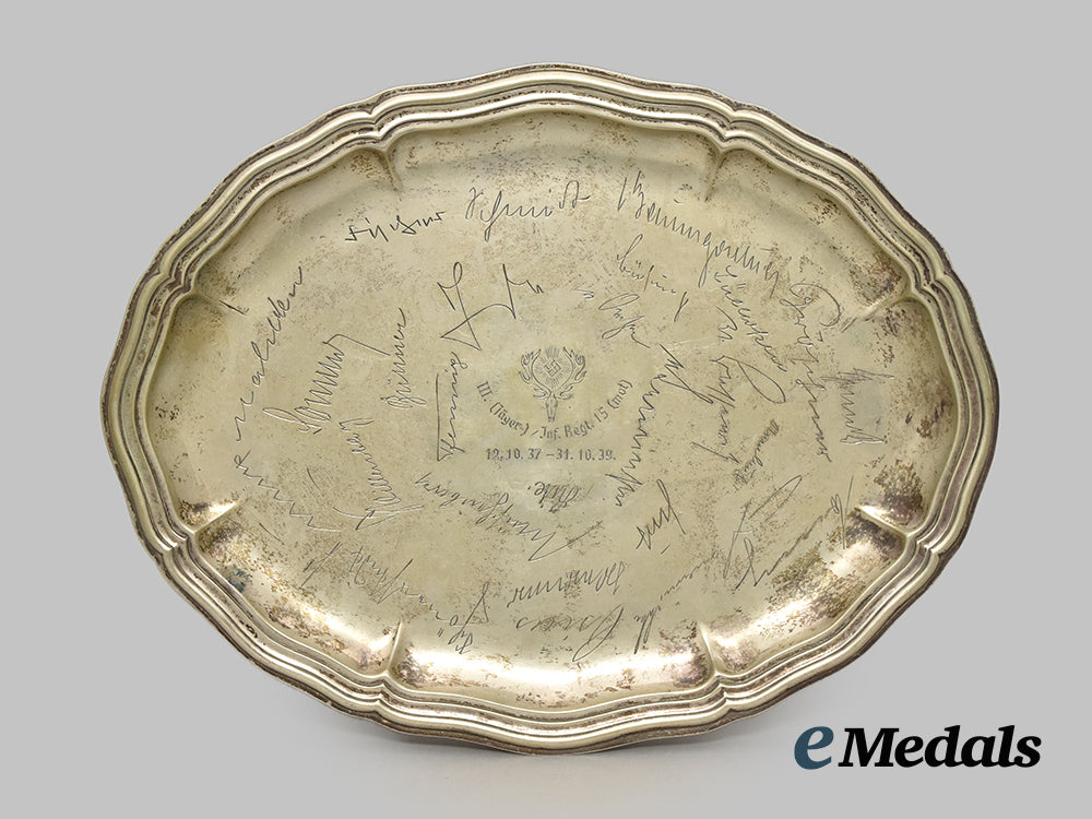 (Infanterie-Regiment 15 Gedenkplatte in Silber). Constructed of silver, the obverse consisting of an oval platter with raised and scalloped edges, bearing a central engraved Deutsche Jägerschaft insignia, situated above an inscription of “III. (JÄGER-) / INF. REGT. 15 (MOT), in turn above dates “12. 10. 37 - 31. 10. 39”, surrounded by the engraved facsimile signatures of presumed Non-Commissioned Officers, the base bearing a crown and crescent moon indicating German manufacture, a silver content number of “835”, and a hallmark, measuring 27.5 cm (w) x 21 cm (h), weighing 256.9 grams, demonstrating a moderate patina throughout, in near extremely fine condition.