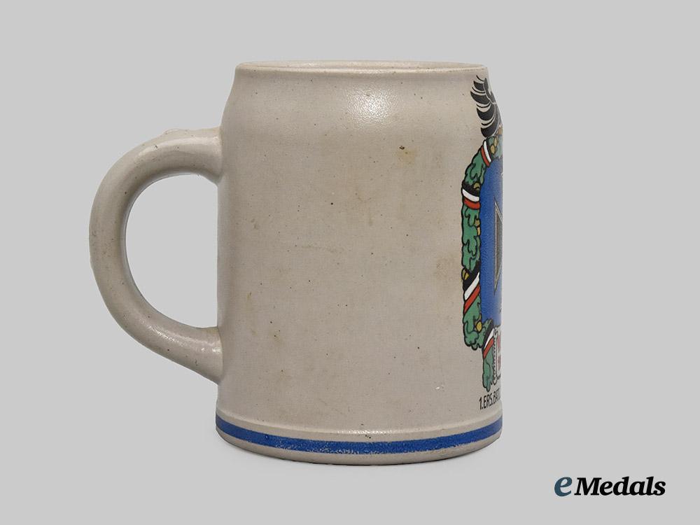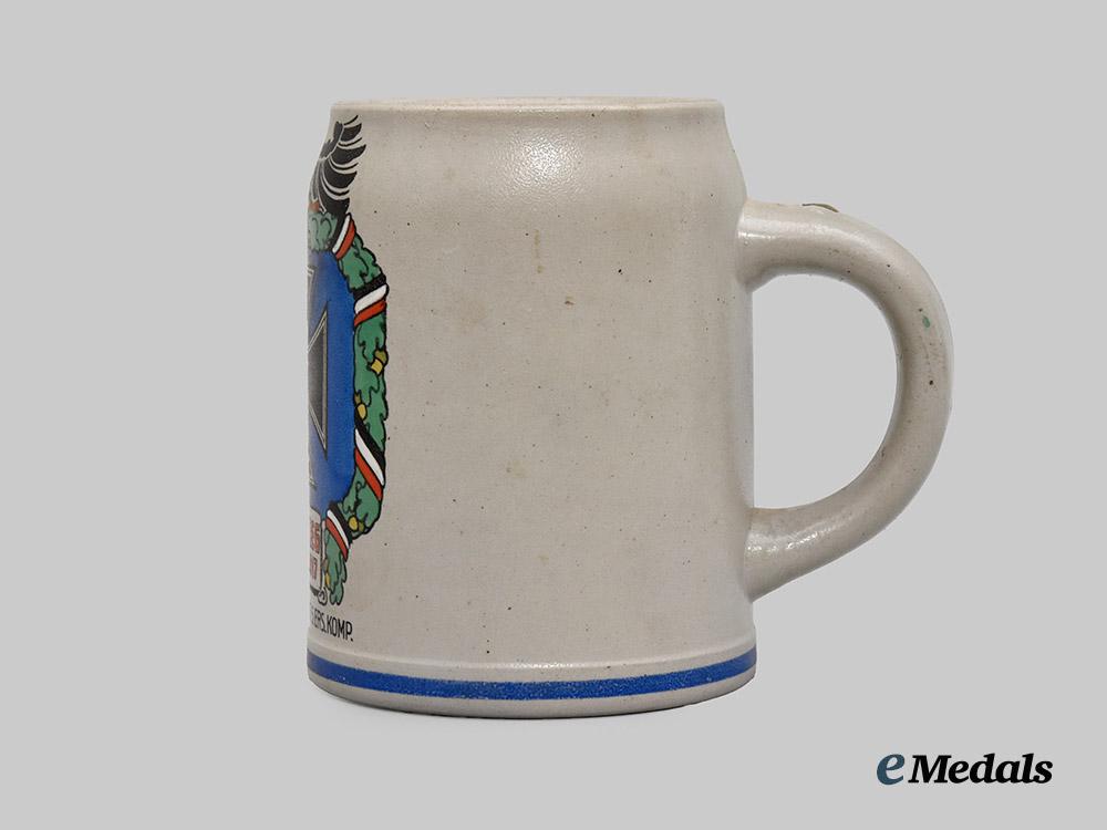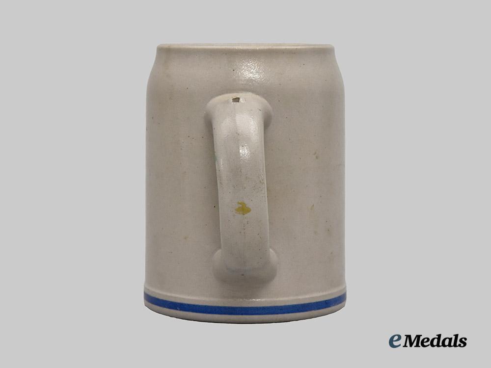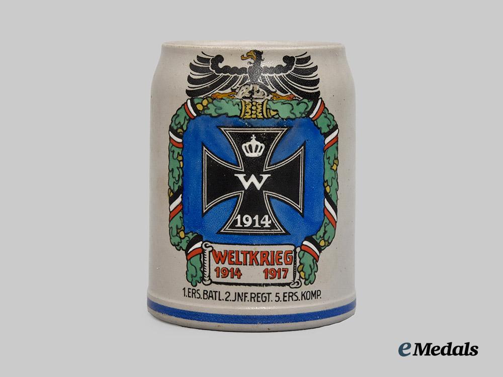 (Erinnerungskrug). Constructed of glazed off-white earthenware, the exterior bearing striking hand-painted imagery consisting of a central 1914 Iron Cross, situated within an oak leaf wreath, wrapped in a black, white, and red Imperial tri-colour ribbon, joined together at the bottom by a banner bearing an inscription of “WELTKRIEG 1914-1917” (“WORLD WAR 1914-1917”), topped by a German national eagle, situated above a unit dedication reading “1. ERS. BTL., 2. INF. RGT., 5. ERS. KOMP” (1. Ersatz-Bataillon, 2. Infanterie-Regiment, 5. Ersatz-Kompanie), the base trimmed with a blue painted border, with a rounded handle protruding from the side, unmarked, measuring 9.5 cm (w) x 12 cm (h) (exclusive of hande), demonstrating a hole to the top of the handle consistent with the removal of a lid and hinge, demonstrating no notable cracks or chips, in better than very fine condition.