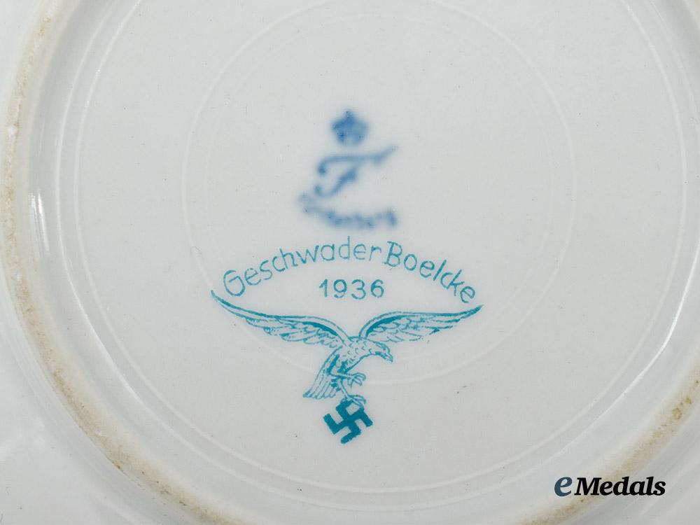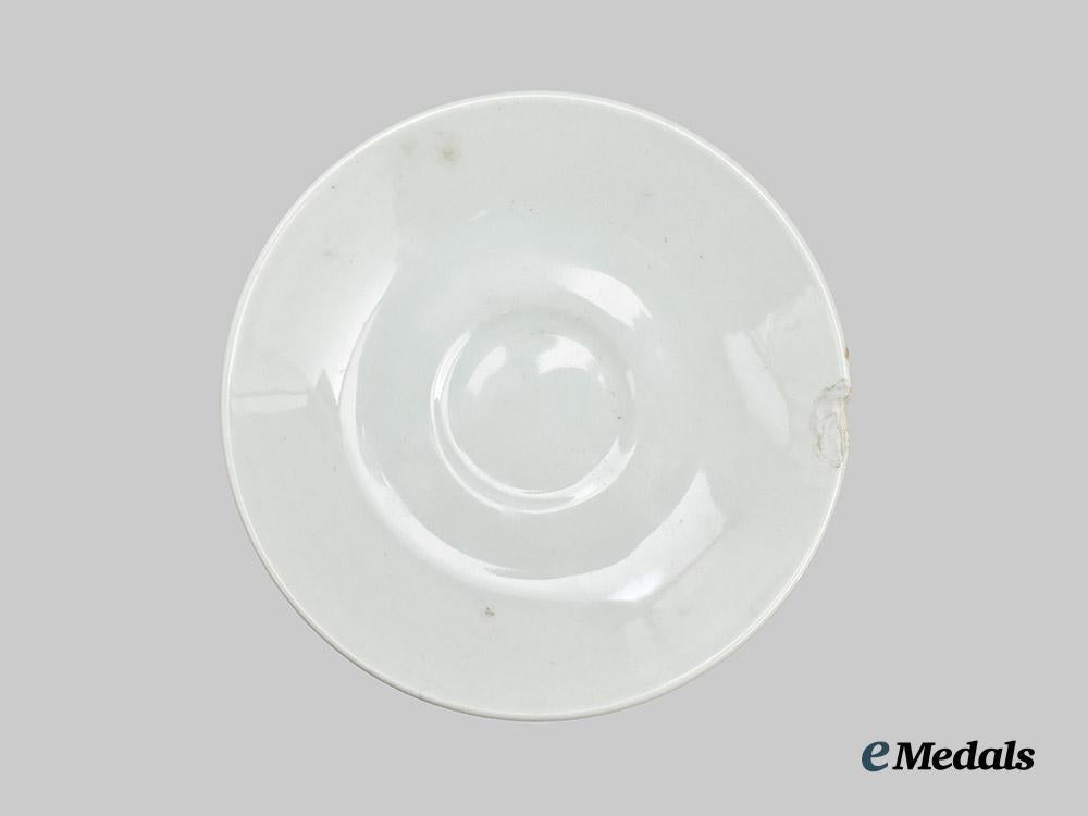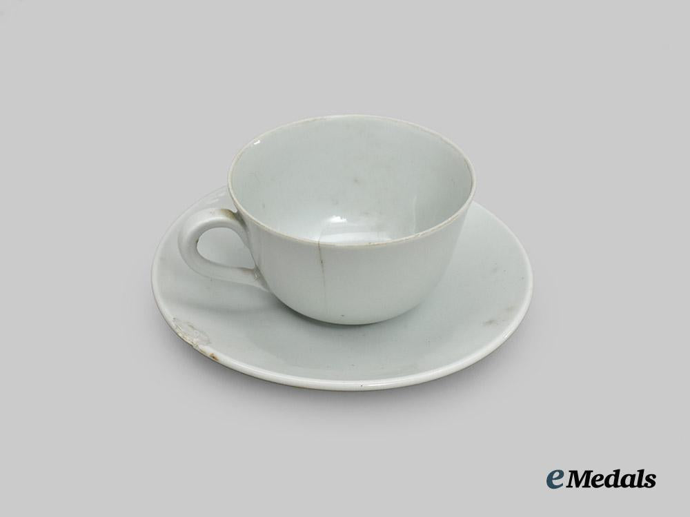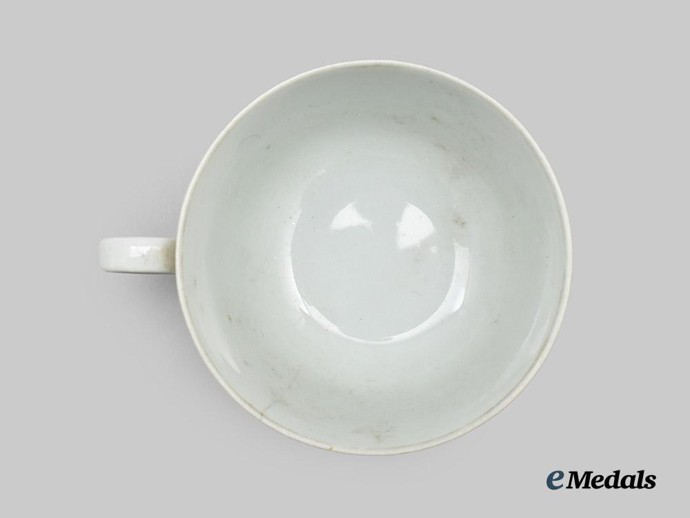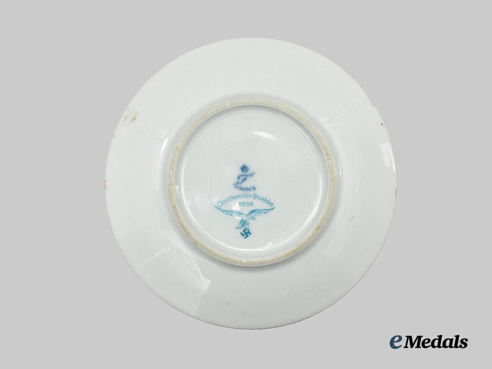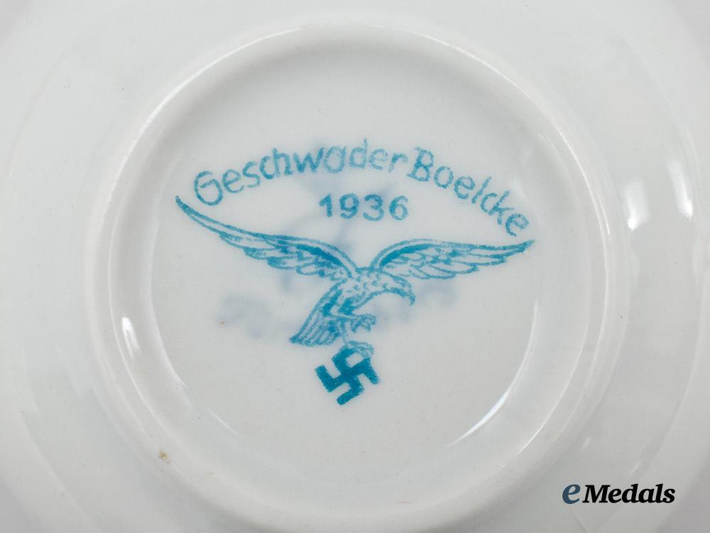 (Luftwaffe Ober- und Untertasse). A matching Kampfgeschwader 154 Boelcke mess hall cup and saucer set, each constructed of glazed pale blue porcelain, the base of each maker marked with the logo of Fürstenberg Porcelain, and stamped with an additional mark of “GESCHWADER BOELCKE 1936” above a droptail-style Luftwaffe eagle clutching a mobile swastika, the saucer measuring 110 mm in diameter, the cup measuring 85 mm (w) (inclusive of handle) x 42 mm (h), with a chip evident to the edge of the sauce and a visible crack extending throughout the height of the cup, an early and matching set in very fine condition.
