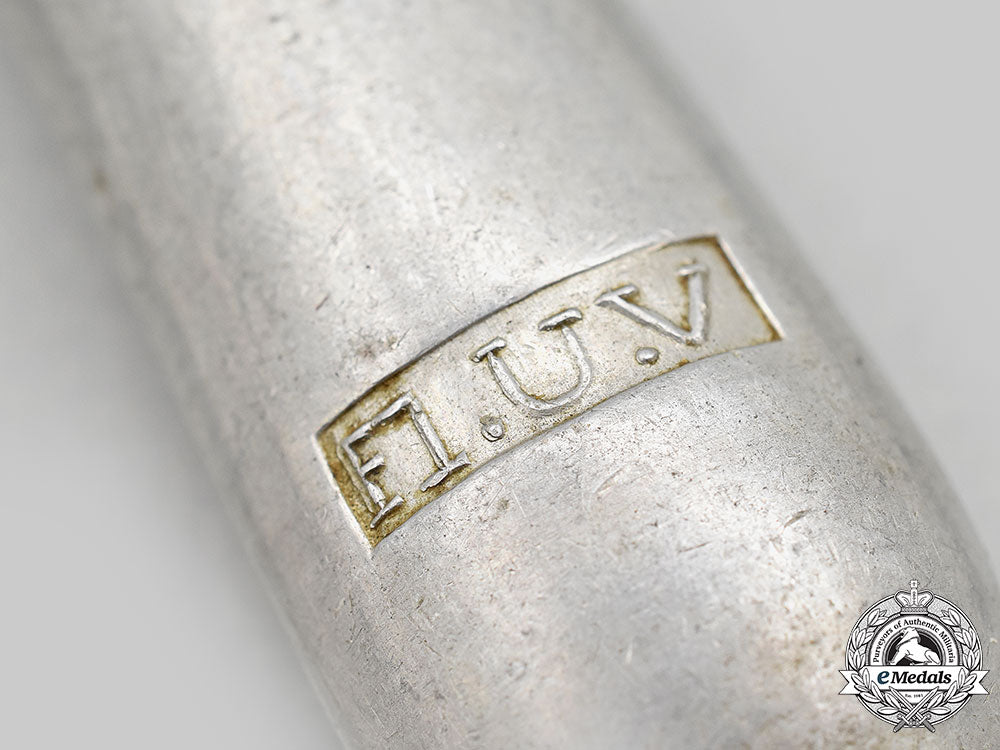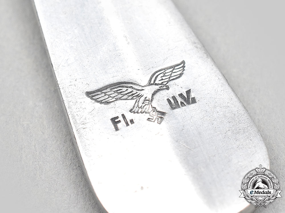 1. Two teaspoons, each constructed of aluminum, the obverse of both bearing stamped Luftwaffe eagles clutching mobile swastikas, one flanked by an inscription of “FL. U. V.” for Flieger Unterkunft Verwaltung (Flight Barracks Administration), the reverse of the other spoon similarly bearing a Flight Barracks Administration Logo, the former stamped on the reverse with a manufacture date of “1939” and a maker’s mark of “BERNDORF”, both measuring 32 mm (w) x 150 mm (l), in overall near extremely fine condition.