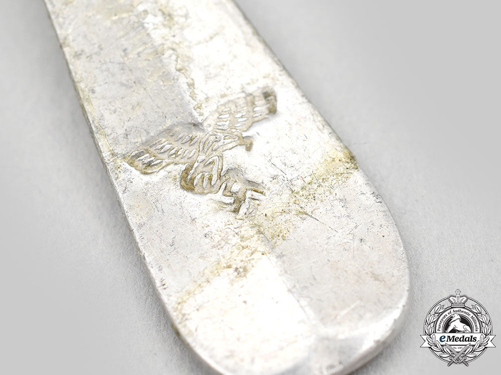 4. A butterknife, of two-piece construction, consisting of an aluminum handle affixed to a non-serrated magnetic steel blade stamped “ROSTFREI” indicating stainless steel construction, the obverse of the handle stamped with a Luftwaffe eagle clutching a mobile swastika, the reverse stamped with a Flight Barracks Administration logo and maker’s mark of “H.M.Z.” for Hessische Metallwarenfabrik Ziegenhain alongside a date of “41”, measuring 23 mm (w) x 245 mm (l), in near extremely fine condition.