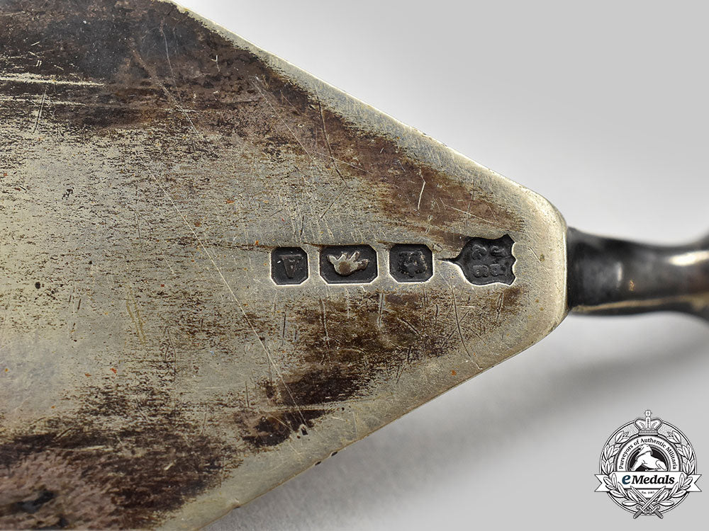6. Also including a trowel, constructed of silver and set on a lacquered wooden handle, the reverse stamped with silver hallmarks tentatively accredited to John Sherwood & Sons, Birmingham, England, measuring 35 mm (w) x 160 mm (l), in very fine condition.