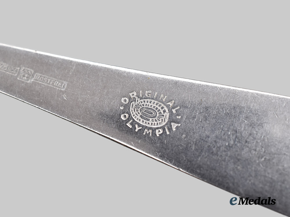 1. A table fork, constructed of magnetic stainless steel, the obverse plain, the reverse marked “SS REICH”, with a maker’s mark of “ORIGINAL OLYMPIA” circumscribing the firm’s arena logo, and an additional mark of “OXYDEX ROSTFREI” indicating stainless steel construction, measuring 25 mm (w) x 210 mm (l), in extremely fine condition.