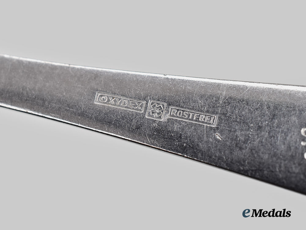 2. A butter knife, of two-piece and partially-magnetic stainless steel construction, the handle marked “SS REICH” and “RONSEUSIL ROSTFREI”, the latter indicating stainless steel construction, the separate blade marked “CLARFELD-ROSTFREI”, measuring 24 mm (w) x 255 mm (l), demonstrating some wear to the lower edge of the blade consistent with usage, in near extremely fine condition.