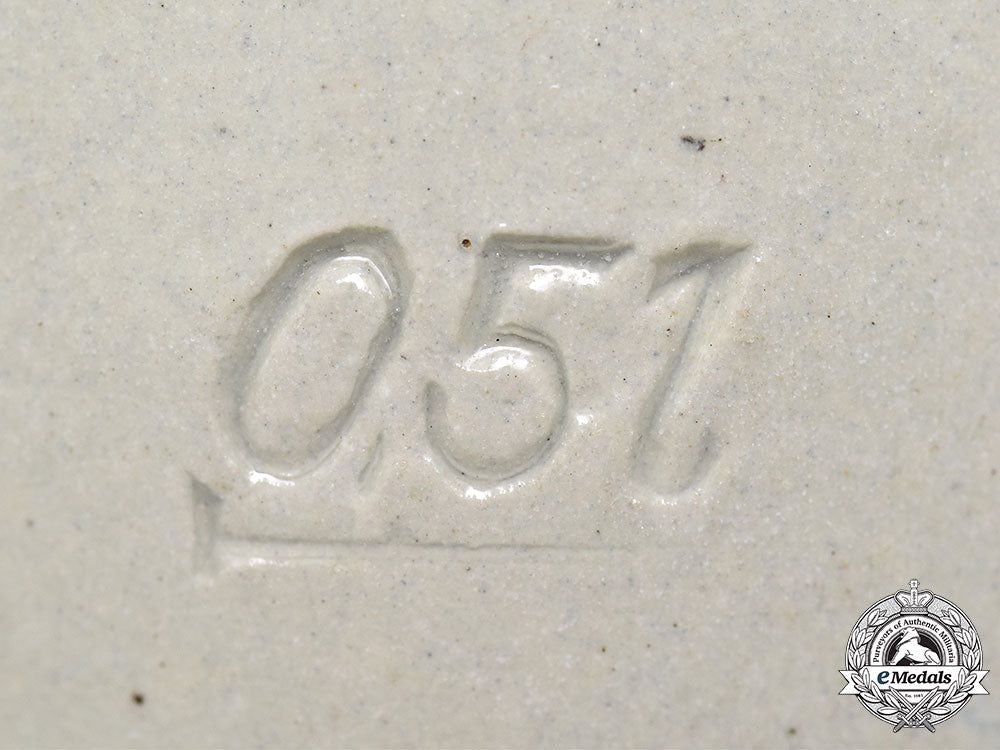 (Stammlager VII A Bierkrug). A rare commemorative stein belonging to a member of the security or administrative personnel of the infamous Stalag VII-A POW camp near Moosburg, Bavaria, constructed of glazed earthenware, the exterior bearing a hand-painted guard tower flanked by a fence and barracks, circumscribed by an inscription of “STALAG VII A KRIEGSWEIHNACHT 1940” (“STALAG VII A CHRISTMAS AT WAR 1940”), with a curved protruding handle flanked by a measurement mark of “0.5L”, the base bearing partially-legible etched marks, measuring 95 mm (w) x 125 mm (h), with some fading of the paint evident but demonstrating no chips or cracks, a rare memento in extremely fine condition.