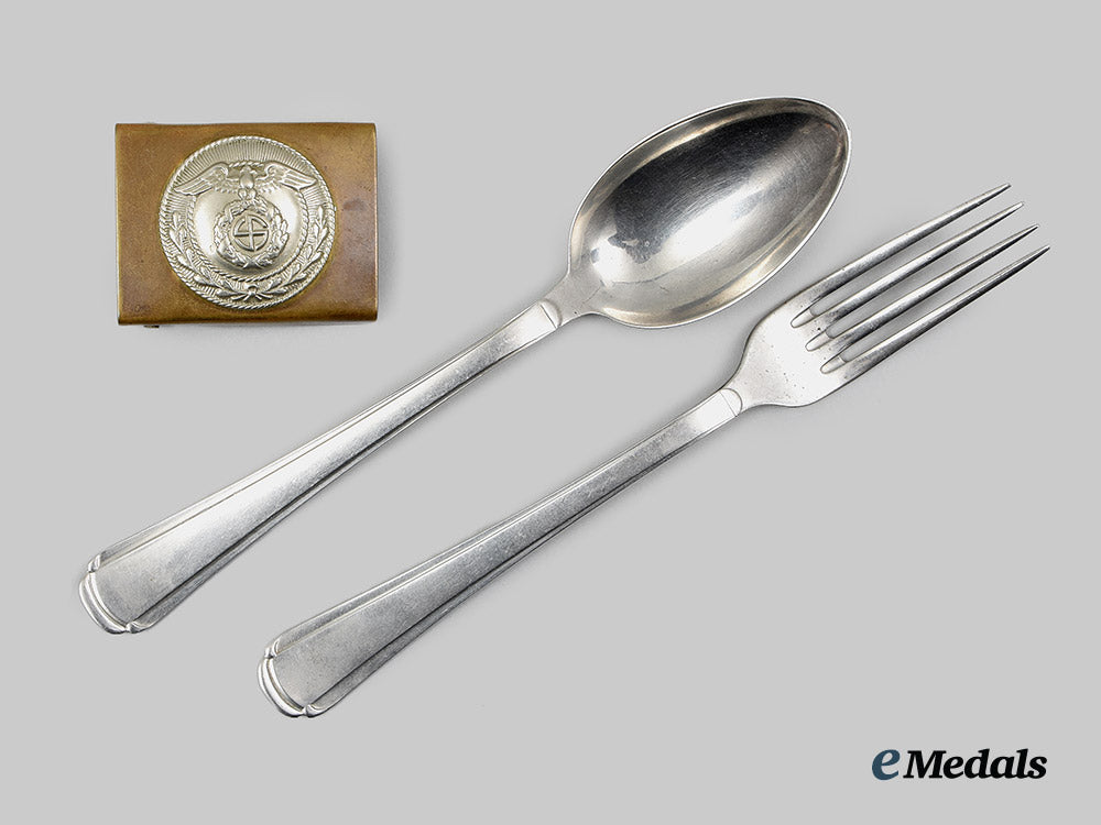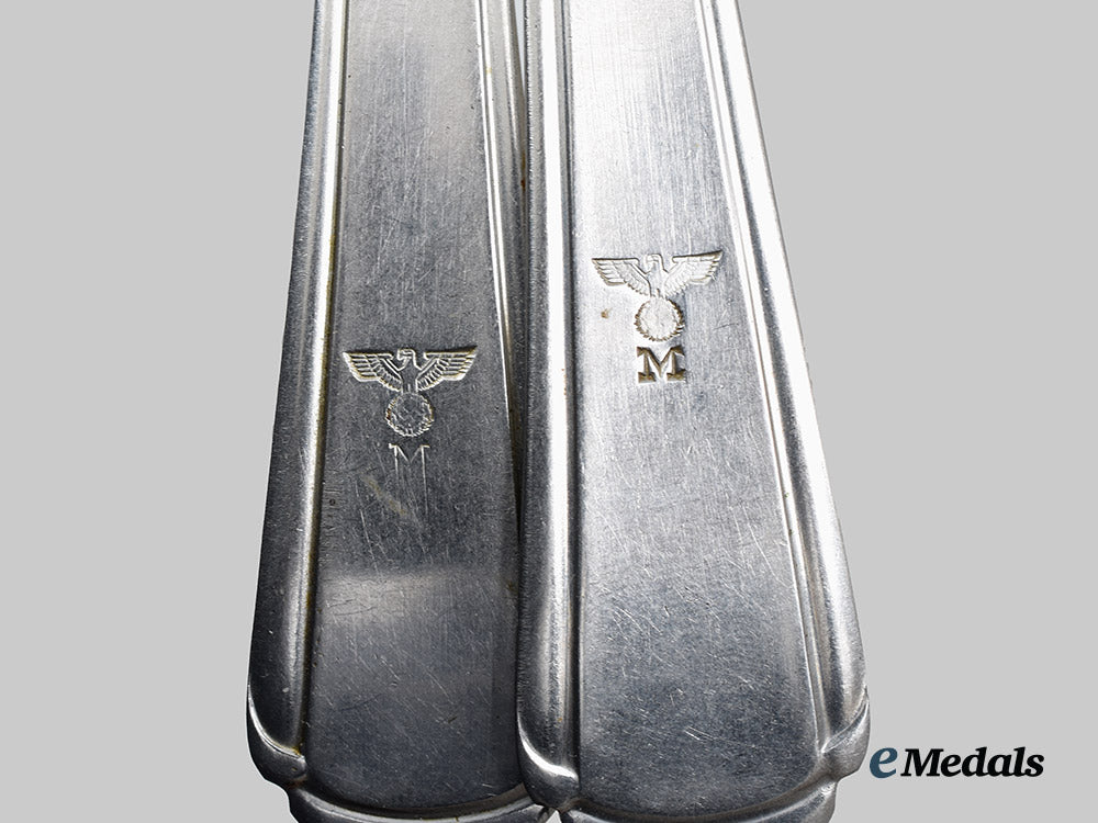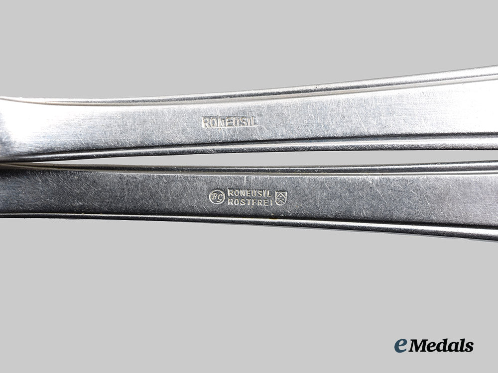 3. A Kriegsmarine mess hall table spoon, constructed of non-magnetic stainless steel, the reverse bearing a Wehrmacht eagle situated above a letter “M” (“MARINE”), maker marked “RONEUSIL”, measuring 44 mm (w) x 214 mm (l), in extremely fine condition.
