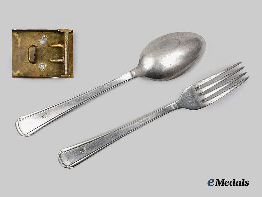 2. A Kriegsmarine mess hall table fork, constructed of non-magnetic stainless steel, the obverse plain, the reverse bearing a Wehrmacht eagle situated above a letter “M” (“MARINE”), maker marked “RONEUSIL” and “ROSTFREI” indicating stainless steel construction, measuring 25 mm (w) x 214 mm (l), in extremely fine condition.