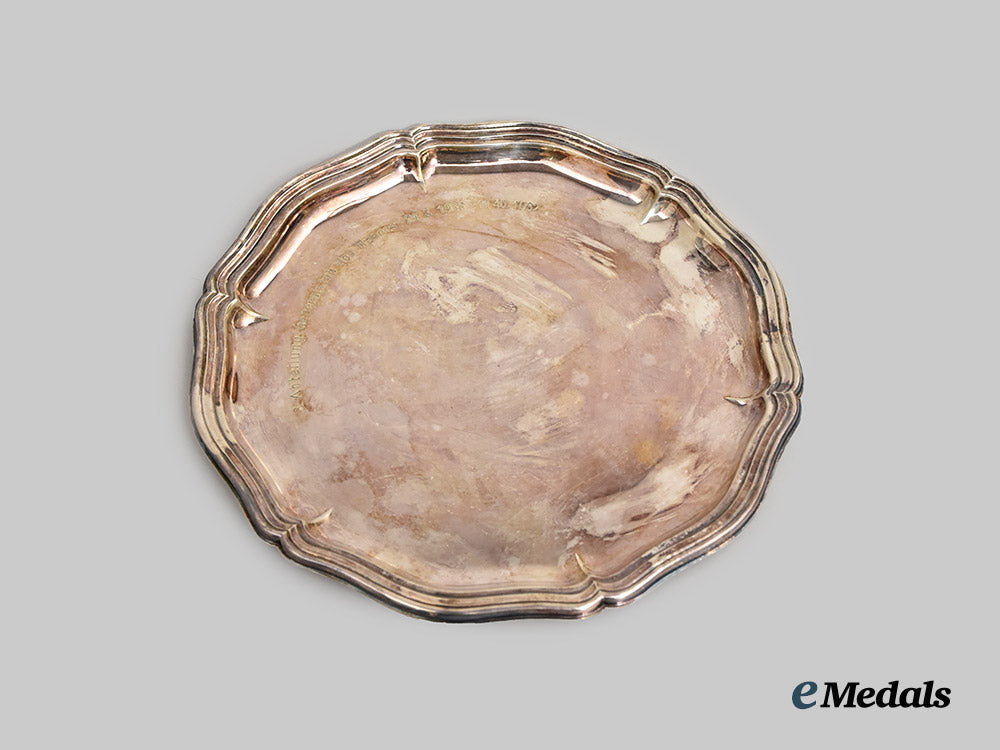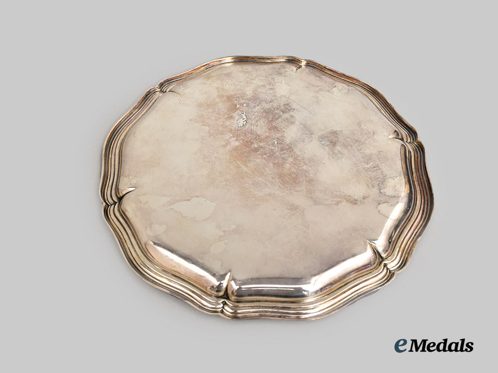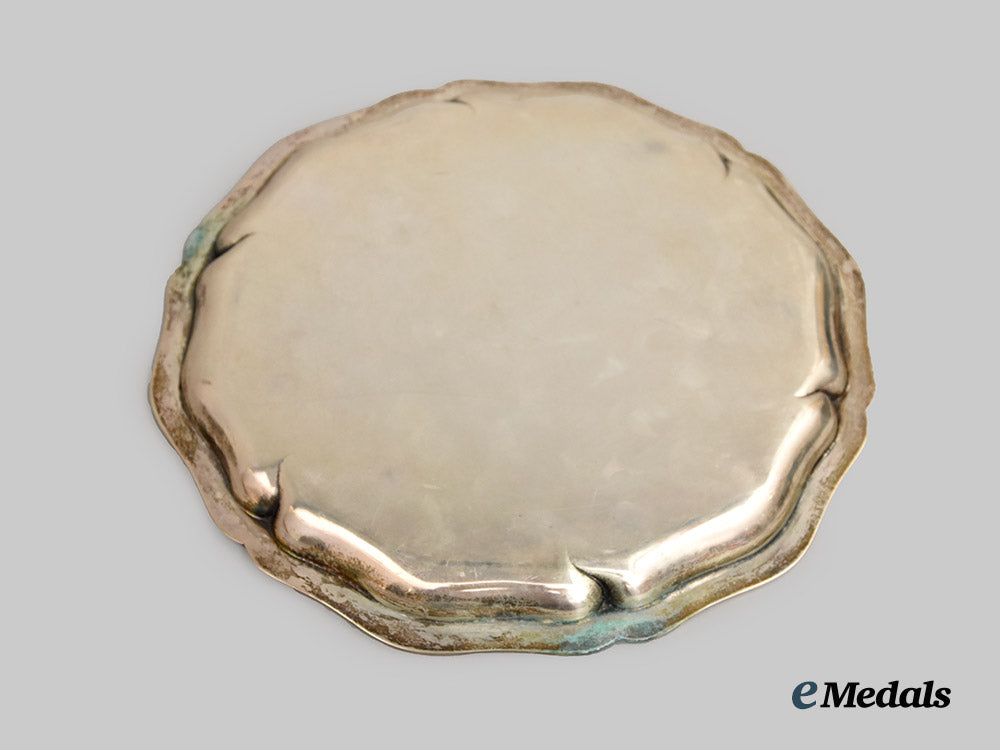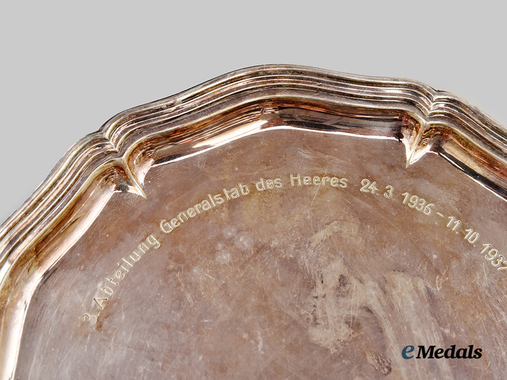 2. One Wehrmacht-era plate, constructed of silver with scalloped edges, bearing an engraved inscription of “3. ABTEILUNG GENERALSTAB DES HEERES 24. 3. 1936 - 11. 10. 1937”, the reverse bearing a crown and crescent moon indicating German manufacture, a silver content number of “835”, and the hallmark of Wilhelm Binder, Schwäbisch Gmünd, measuring 20 cm in diameter, weighing 157.3 grams, dated to Schörner’s time as a Group Leader of the 3. Abteilung (3rd Company) Generalstab (General Staff), in extremely fine condition.