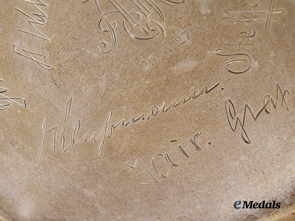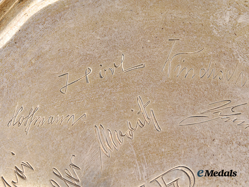 1. One Reichswehr-era plate, constructed of silver with scalloped edges, the obverse bearing a central engraved monogram of 19. (Bayer.) Infanterie-Regiment, situated above a date of “23. 11. 27”, surrounded by the expertly-engraved names of presumed Officers of the unit, the reverse bearing a crown and crescent moon indicating German manufacture, a silver content number of “800”, and a hallmark of “M.T. WETZLAR” for the Munich-based silversmith, measuring 21.5 cm in diameter, weighing 222.8 grams, dated to Schörner’s time as commander of 16. Kompanie of the unit and days before his wedding on 27 November, indicating a possible wedding gift, in extremely fine condition.