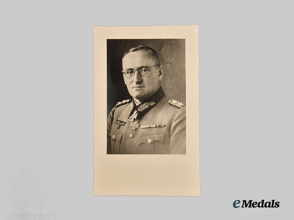 3. A period-reproduced studio photo of Schörner, depicted in a General’s uniform and with the Pour le Mérite and Knight’s Cross of the Iron Cross clearly visible, the reverse in unused postcard format and bearing an Agfa paper mark, measuring 8.5 cm (w) x 13.5 cm (h), in extremely fine condition.