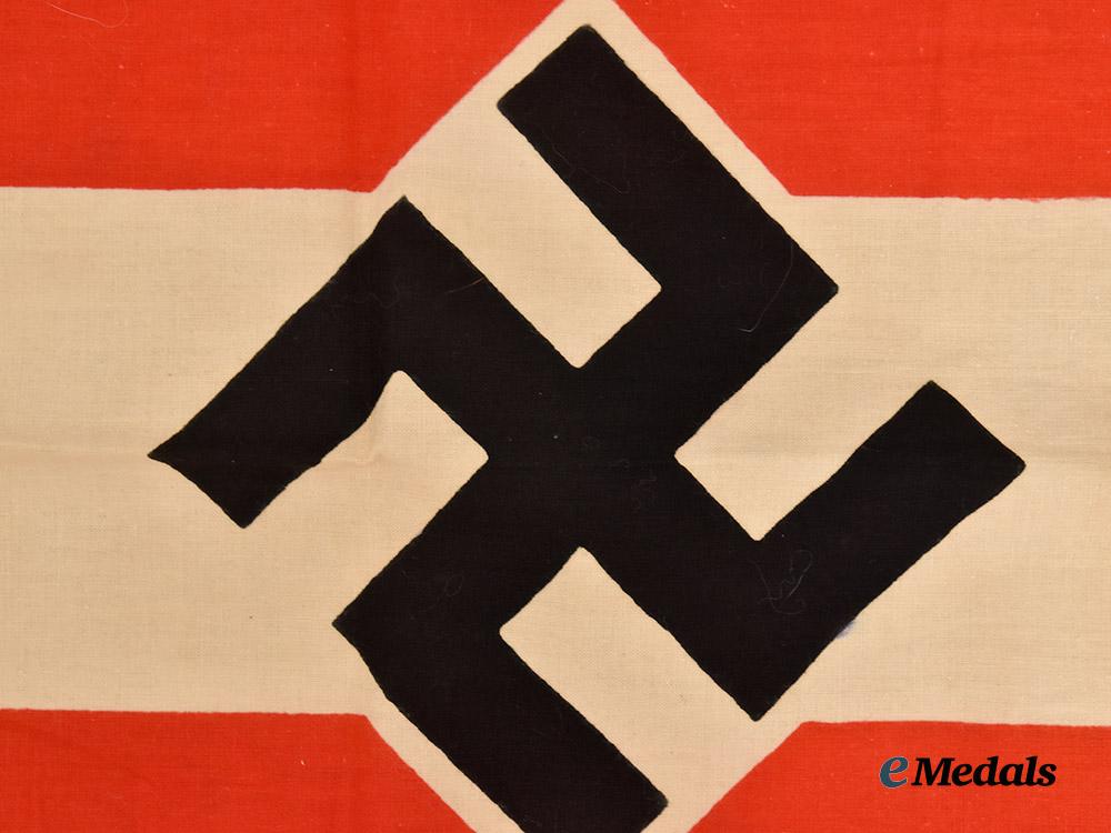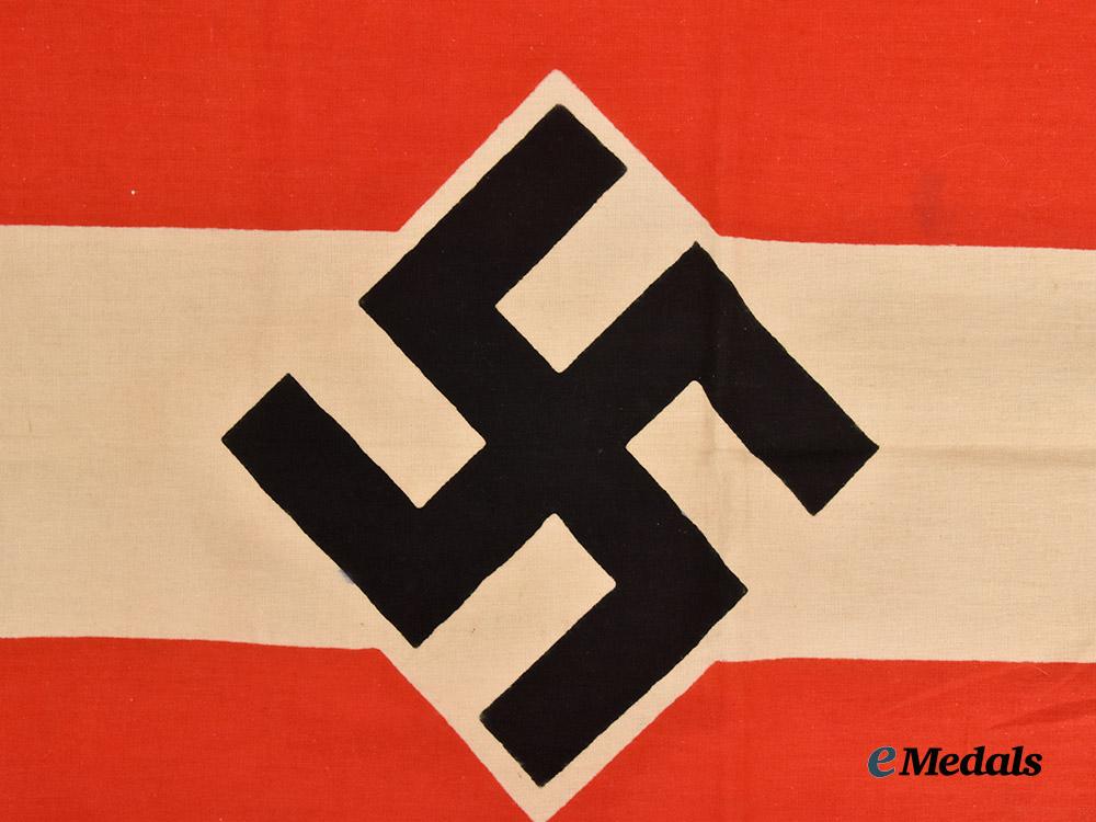 (HJ Fahne). A small HJ event flag, constructed of a red and white cotton/rayon blended cloth base, featuring double-sided off-centre diamonds oriented toward the hoist edge, in turn bearing dyed black mobile swastikas, the hoist edge featuring a hollow channel through which is looped an original drawstring, unmarked, measuring 50 cm (l) x 34 cm (h), demonstrating minor and age-appropriate discoloration, in extremely fine condition.