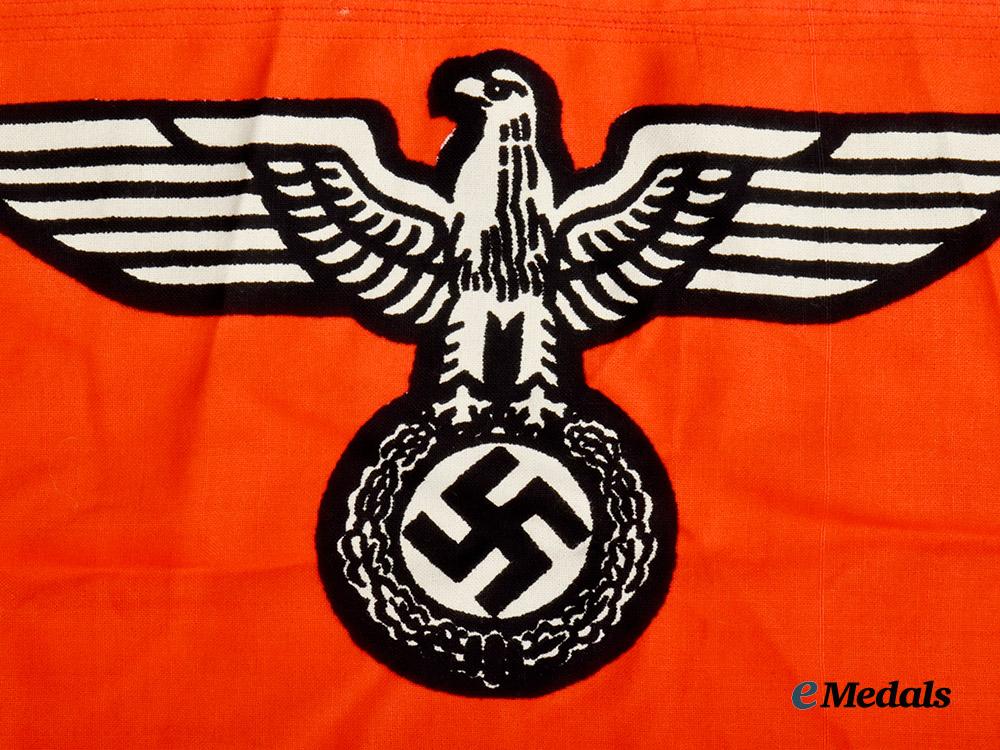 (Reichskriegsflagge). A small state service flag, constructed of a red cotton/rayon blended base, overlaid by central double-sided white cotton discs bearing ribbed black swastikas, with the upper hoist edge of each side bearing a black-and-white government-style German national eagle clutching a wreathed mobile swastika, reinforced along three edges with multiple rows of machine stitching, the hoist edge reinforced with a layer of white cotton with a hollow channel retaining an original suspension rope, the reverse of the hoist edge stamped with a Kriegsmarine issue mark, an inscription of “REICHSDIENSTFL.”, size dimensions of “80 X 135” (in centimeters), and a maker’s mark of “BUNTSTOFF BERLIN”, demonstrating no notable damage or fatigue, an interesting military-issue state flag in near mint condition.