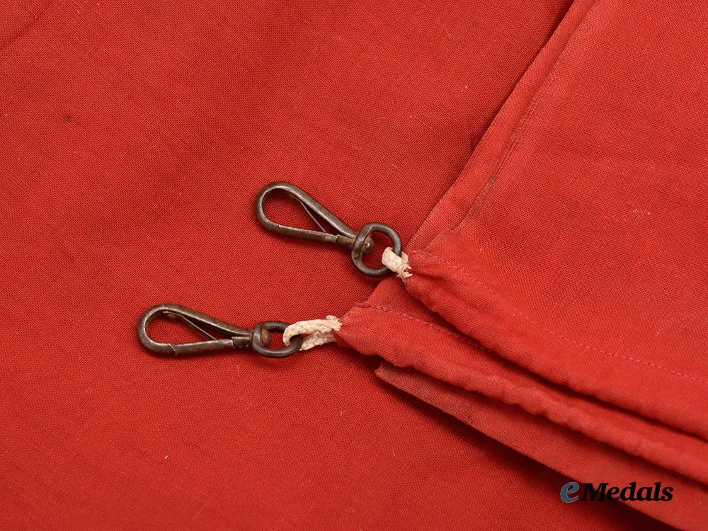 (NSDAP Fahne, große Ausführung). Constructed of a red cotton/rayon blended cloth base, overlaid by double-sided central white cotton/rayon-blended cloth discs, in turn bearing black mobile swastikas, the hoist edge stitched with functional magnetic metal spring clips at both the top and bottom corners for secure display in all weather conditions, unmarked, measuring 232 cm (w) x 115 cm (h), demonstrating minor soiling throughout but with no notable damage or wear evident, very fine.