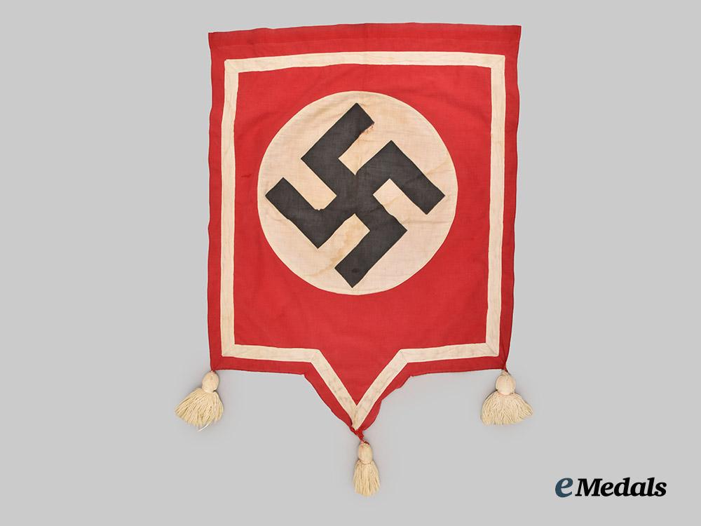 (NSDAP Podiumsfahne). An NSDAP podium banner, constructed of a red blended cotton cloth base, overlaid by double-sided central white rayon discs measuring 34 cm in diameter, in turn bearing dyed black mobile swastikas, surrounded by a white cotton border, the lower edge featuring two white threaded pommels, the upper hoist edge featuring a hollow channel for the insertion of a suspension apparatus, unmarked, measuring 52 cm (w) x 72 cm (h), demonstrating moderate soiling and minor material fatigue throughout, a banner commonly displayed on a speakers’ dais at NSDAP events in very fine condition.