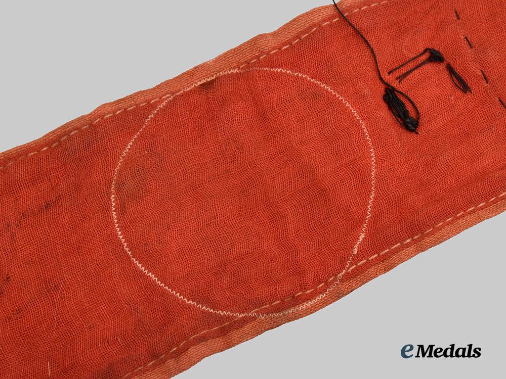 (NSDAP Armbinde mit Auszeichnungen und Insignien). An Allied veteran-assembled group of insignia and awards, including an NSDAP member’s armband, narrow version, embroidered with an Honour Cross of the World War 1914/1918 for Combatants, an HJ membership badge, a Reichs Association of Small Gardeners membership badge, two Wehrmacht tunic buttons, a Wehrmacht shoulder board pip, two Kriegsmarine trade insignia, and an album cover emblem, unmarked, the armband measuring 8 cm (w) x 45 cm (l) when unfolded on a flattened surface, demonstrating minor soiling and material fatigue throughout, in near extremely fine condition.