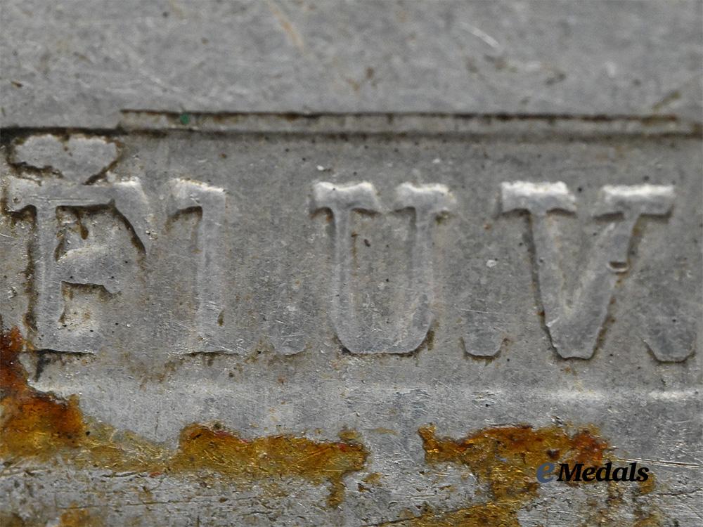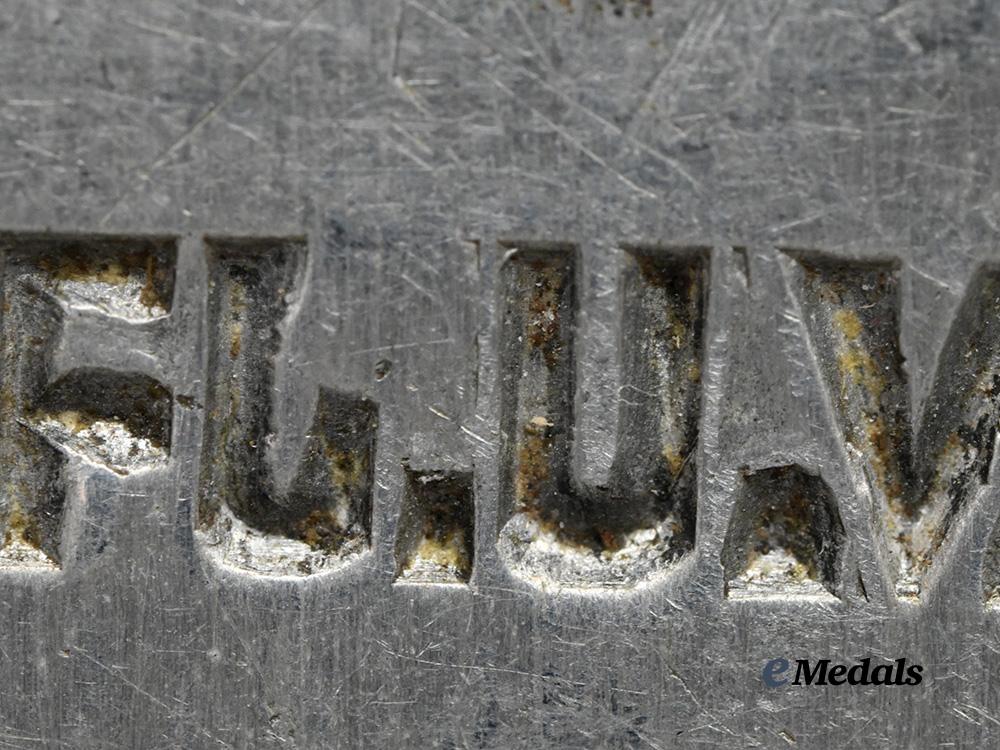 2. Two table spoons, both constructed of aluminum, the obverse of each bearing a stamped Luftwaffe eagle clutching a mobile swastika, the reverse of each bearing a Luftwaffe Flight Barracks Administration (FL.U.V.) mark, one maker marked with the logo of Wilhelm Jordan, Solingen, with a manufacture date of “39”, the other maker marked with the logo of Hessische Metallwarenfabrik, Ziegenhain, with a manufacture date of “40”, both measuring 48 mm (w) x 210 mm (l), in near extremely fine condition.