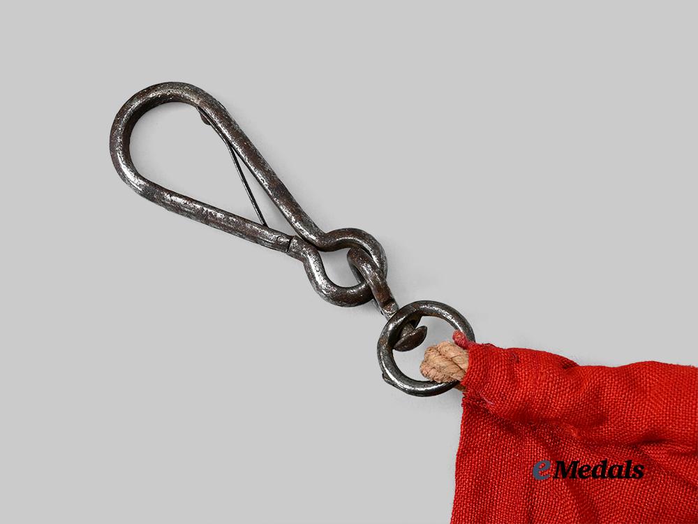 (Fahne). A large national flag, constructed of two panels of heavy red cotton-blended cloth securely stitched together lengthwise, overlaid by double-sided white cotton-blended cloth discs measuring 140 cm in diameter, in turn bearing multi-piece black mobile swastikas, the hoist edge with a hollow channel through which is looped an original rope culminating at each end in a functional magnetic metal spring clip for suspension, with an additional eyelet set mid-way through the hoist edge featuring an additional clip, unmarked, measuring 180 cm (h) x 450 cm (l), demonstrating moderate soiling and material fatigue throughout, including some bleeding of the red dye into the disc resulting from display or storage conditions, in very fine condition.