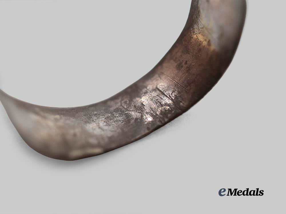 (Wehrmacht Fingerring in Silber mit Etui). Constructed of silver and copper, the exterior consisting of a dimpled silver band and bearings raised copper Totenkopf, the interior stamped with a silver content number of “800” with a hallmark, corresponding to a men’s size 9, weighing 2.9 grams, accompanied by its original card stock presentation case, an unusual example of a ring privately-purchased by Wehrmacht and SS personnel in extremely fine condition.