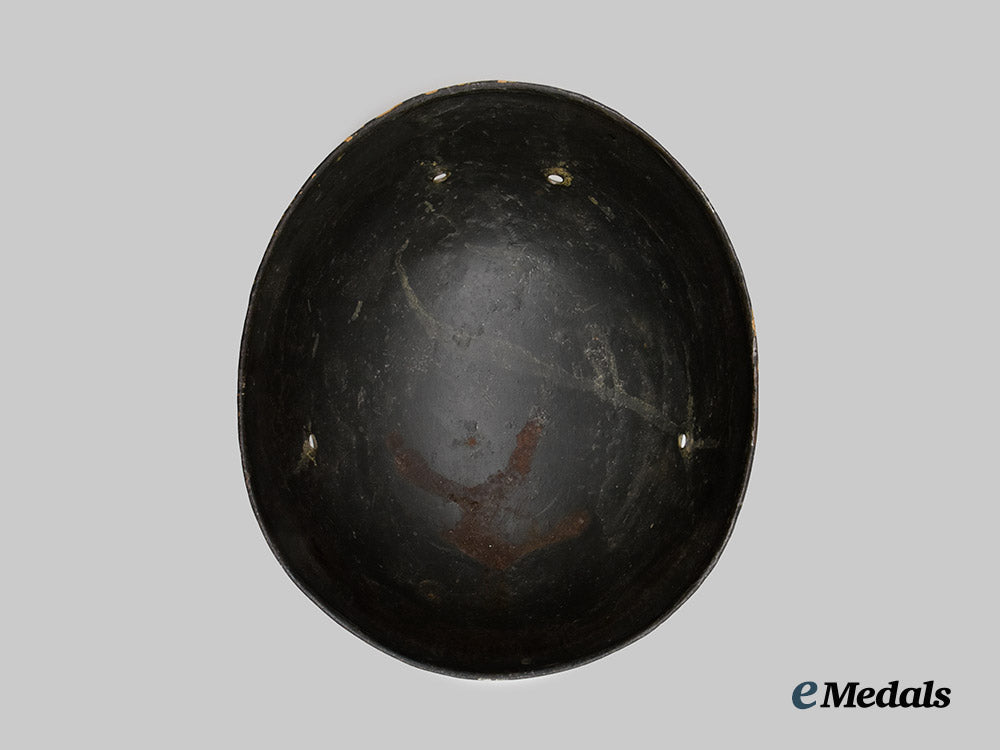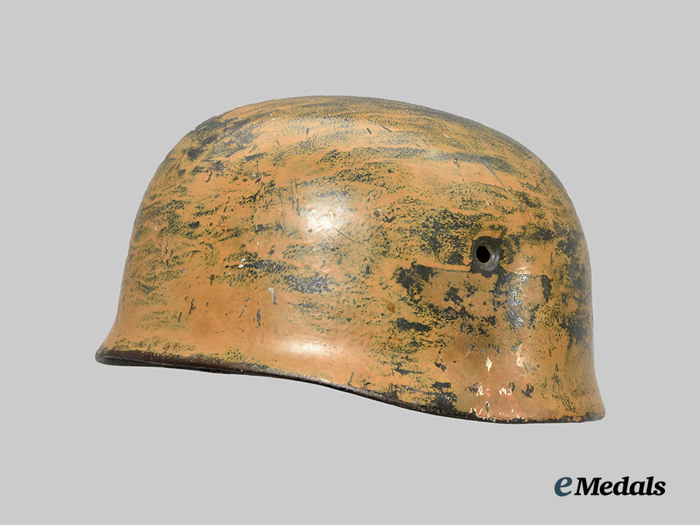 (Luftwaffe Stahlhelm M38 für Fallschirmjäger mit Tropenlackierung). A rare and batle-worn Luftwaffe Fallschirmjäger M38 steel helmet shell, constructed of magnetic molybdenum steel. The exterior features a hand-painted, distressed, khaki-tan camouflage for use in tropical conditions in both the North African and Mediterranean campaigns. Four eyelets are distributed around the outer circumference for the accommodation of ventilation shafts and spanner bolts, all of which have been lost to time. The outline of a Luftwaffe decal is visible directly beneath the left side ventilation hole, and has been deliberately painted over. The interior is empty and lacks all original fixtures, with a replacement slate-grey paint applied throughout. In addition to the missing hardware, the helmet demonstrates other issues consistent with age and field use, including sporadic scratching of the shell and moderate surface oxidation of the interior which, in conjunction with the replacement paint, obscures any marks on the shell. A superb Fallschirmjäger memento in very fine condition.
