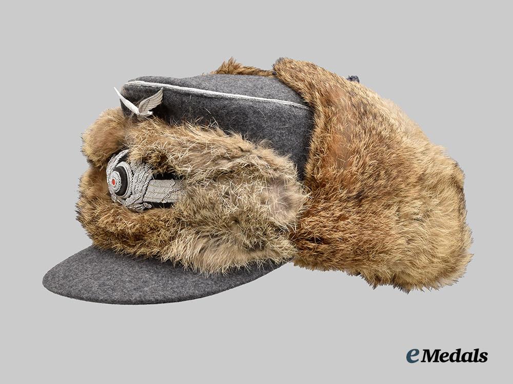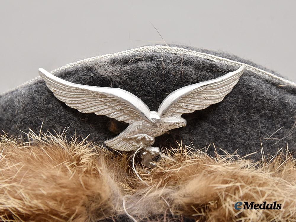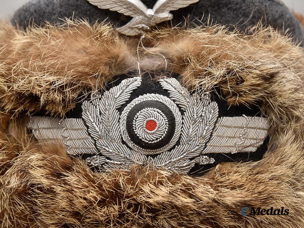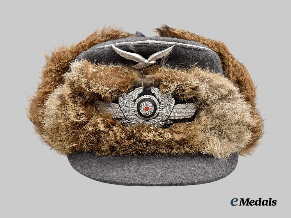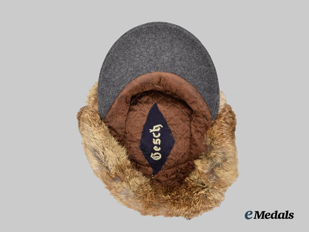 (Luftwaffe Pelzmütze für Offiziere). A unique and extremely well-reserved Luftwaffe Officer’s winter field cap, constructed of dark grey wool. The crown is fully surrounded by a layer of heavy fur, extending across the peak and culminating in two ear flaps which offer optional ear and neck protection to the wearer in inclement weather conditions. When not in use, the flaps roll up and secure in place over the crown with two drawstrings. A length of silver aluminum wire piping trims the outer edge of the crown. Pinned onto the peak is an aluminum insignia consisting of a Luftwaffe eagle clutching a mobile swastika, measuring 65 mm (w) x 45 mm (h). Stitched onto the centre of the fur directly below the eagle is an additional Officer’s-grade insignia consisting of a padded dark grey wool backer bearing a silver aluminum wire tri-colour cockade, flanked by wings of identical construction. Completing the exterior features is a protruding visor with a card stock core, fully lined in identical wool. The interior is encompassed by a padded brown rayon liner featuring a cross-stitched quilted pattern throughout the crown. Stitched onto the top is a dark brown wool trapezoid bearing an embroidered silver-grey owner’s surname of “GESCH”. Otherwise unmarked, the cap measures approximately 20 cm (w) x 28 mm (l) x 16 cm (h). Demonstrating only minor signs of fatigue consistent with age and field wear, this upgraded and privately purchased Officer’s cap remains in an extremely fine condition.