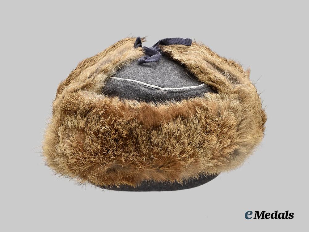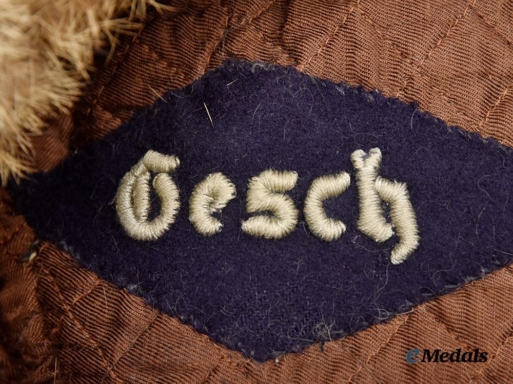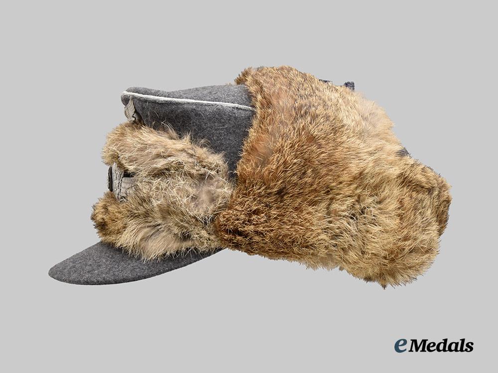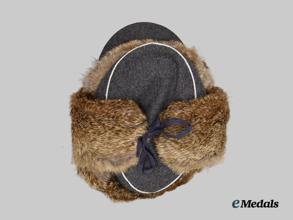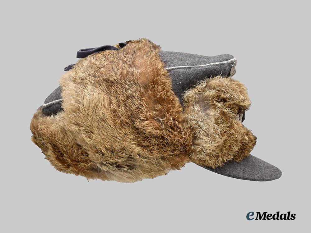 (Luftwaffe Pelzmütze für Offiziere). A unique and extremely well-reserved Luftwaffe Officer’s winter field cap, constructed of dark grey wool. The crown is fully surrounded by a layer of heavy fur, extending across the peak and culminating in two ear flaps which offer optional ear and neck protection to the wearer in inclement weather conditions. When not in use, the flaps roll up and secure in place over the crown with two drawstrings. A length of silver aluminum wire piping trims the outer edge of the crown. Pinned onto the peak is an aluminum insignia consisting of a Luftwaffe eagle clutching a mobile swastika, measuring 65 mm (w) x 45 mm (h). Stitched onto the centre of the fur directly below the eagle is an additional Officer’s-grade insignia consisting of a padded dark grey wool backer bearing a silver aluminum wire tri-colour cockade, flanked by wings of identical construction. Completing the exterior features is a protruding visor with a card stock core, fully lined in identical wool. The interior is encompassed by a padded brown rayon liner featuring a cross-stitched quilted pattern throughout the crown. Stitched onto the top is a dark brown wool trapezoid bearing an embroidered silver-grey owner’s surname of “GESCH”. Otherwise unmarked, the cap measures approximately 20 cm (w) x 28 mm (l) x 16 cm (h). Demonstrating only minor signs of fatigue consistent with age and field wear, this upgraded and privately purchased Officer’s cap remains in an extremely fine condition.