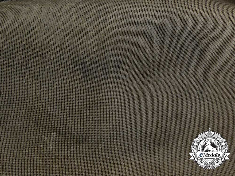 This is a unique overseas cap was purchased from a returning veteran with an interesting history behind it. The cap is constructed of field-grey wool with fold-down side and back panels with gently sloping, downward scallops to the front. It features a single white machine stitched seam along the outer edge of the cap, and double white machine stitched seams along the upper of the panels. At the front center is a set of matching BeVo SS insignia, consisting of a machine embroidered Waffen-SS eagle on a black backer, and a machine embroidered Waffen-SS skull. Both are crudely sewn to the cap crudely with olive-green thread (see footnote). The inside is lined in an olive-drab coloured cotton/rayon blend fabric, with some traces of the manufacturer’s stamp still remaining, but illegible. The cap measures approximately 295 mm x 120 mm (folded). The inside of the cap is partially soiled and slightly salty from wear, the insignia appear worn but overall well preserved, with some light scattered mothing throughout. Overall, this is a well preserved veteran purchase Waffen-SS cap with an interesting and unique story.