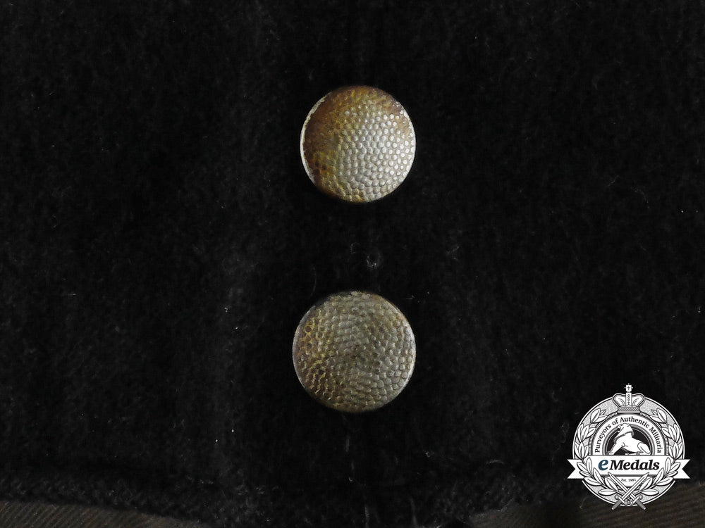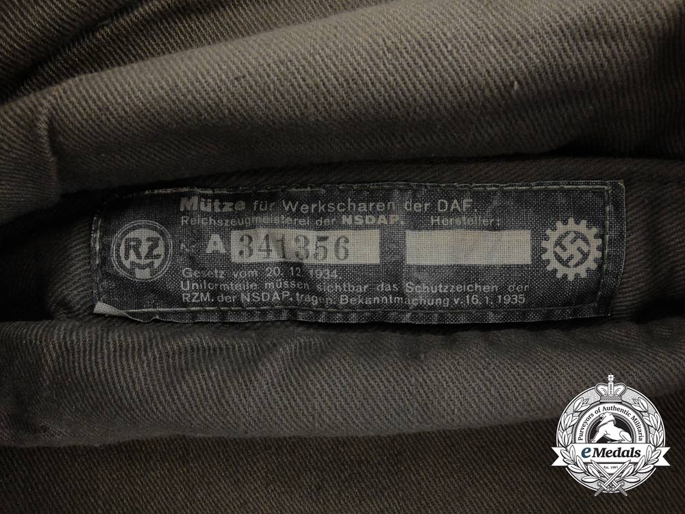 Constructed with a black wool exterior, with two rising peaks forming a valley between the two, the edges of the peaks and the sides of the cap trimmed in silver-coloured bullion piping in a thatched pattern, the side piping gently sloping downward towards the front, eagle insignia in rolled silvered bullion wire in various textures on a black wool base, sewn in place on the peak at the front, illustrating a right-facing spread-winged eagle, its talons gripping a wreathed swastika, with two silvered magnetic pebbled metal buttons below. The interior with an intentionally-designed partial sweatband at the front and emboss stamped, the stamp clearly inscribed "DEUTSCHE" on the top line, lined in blue rayon, a manufacturer's label stitched in place on the left side of the peak in the dome, the label printed in black ink with a large RZM insignia at the left and a large DAF insignia at the right, marked "Mütze für Werkscharen der DAF" (Cap for DAF Work Groups) and "Reichszeugmeisterei der NSDAP.", numbered "Nr. A 160363", marked "Hersteller" (Manufacturer) and coded "104", above "Gesetz vom 20. 12. 34 / Uniformteile müssen sichtbar das Schutzzeichen der RZM der NSDAP. Iragen Bekanntmachung v. 16. 1. 1935", with the size stamped "59" in white ink on the right side of the peak in the dome. The cap measures 120 mm x 300 mm, exhibiting light soiling on the interior lining near the opening, very clean, with intact stitching and is free of interruptions in the fabric, near extremely fine.