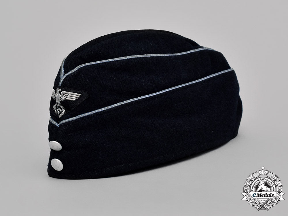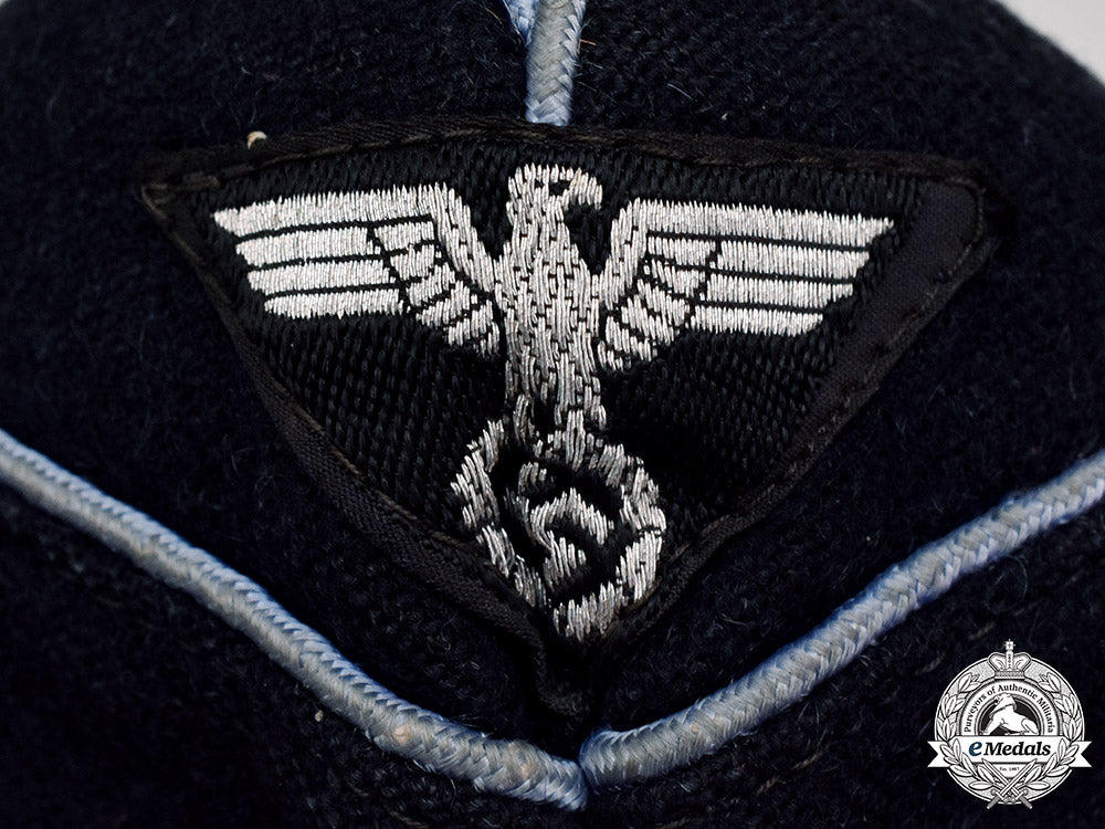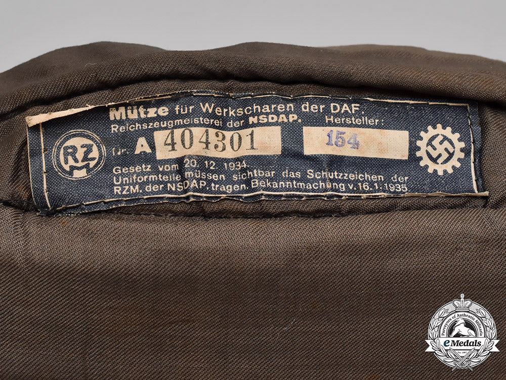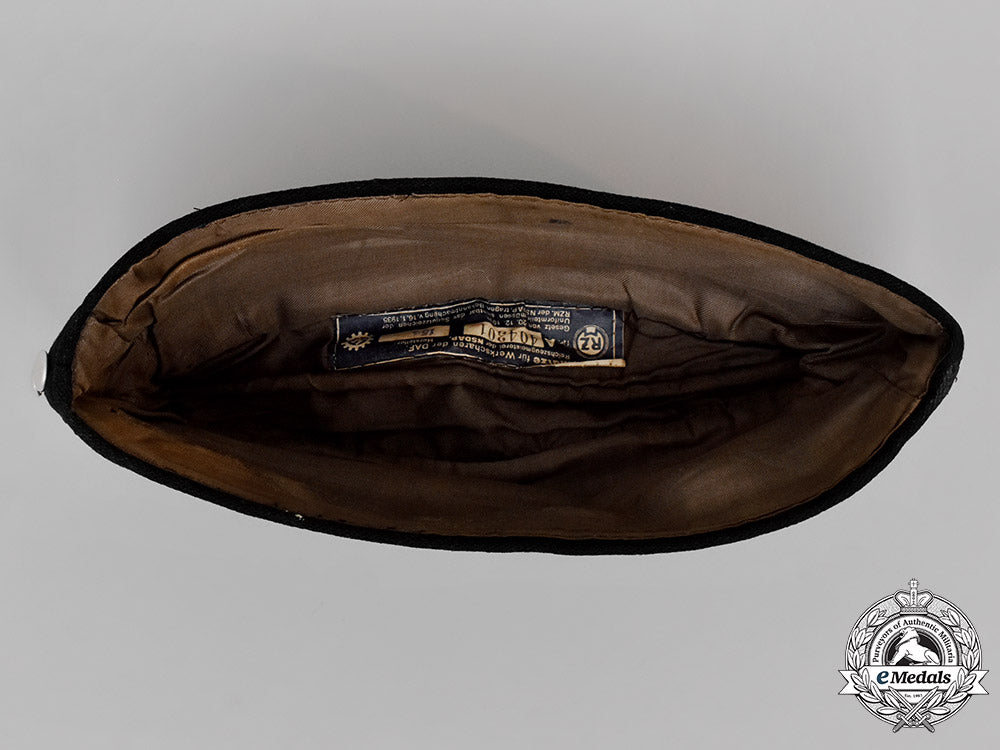 (Deutsche Arbeitsfront Offiziersschiffchen). Constructed of thick dark blue wool, with faux fold-down scalloped panels to the front and side. The peak of the crown as well as its panels decorated with light blue piping. The front of the cap with an eagle insignia sewn to it, constructed of silver aluminum bullion wire on a black wool backer. Below the eagle are two vertically oriented pebbled silver aluminum bullion buttons. The interior lined with an olive green cotton liner, with an RZM tag stitched to the crown, stamped “404301” and “154” in black ink. It measures 284 mm (w) x 105 mm (h); in extremely fine condition.