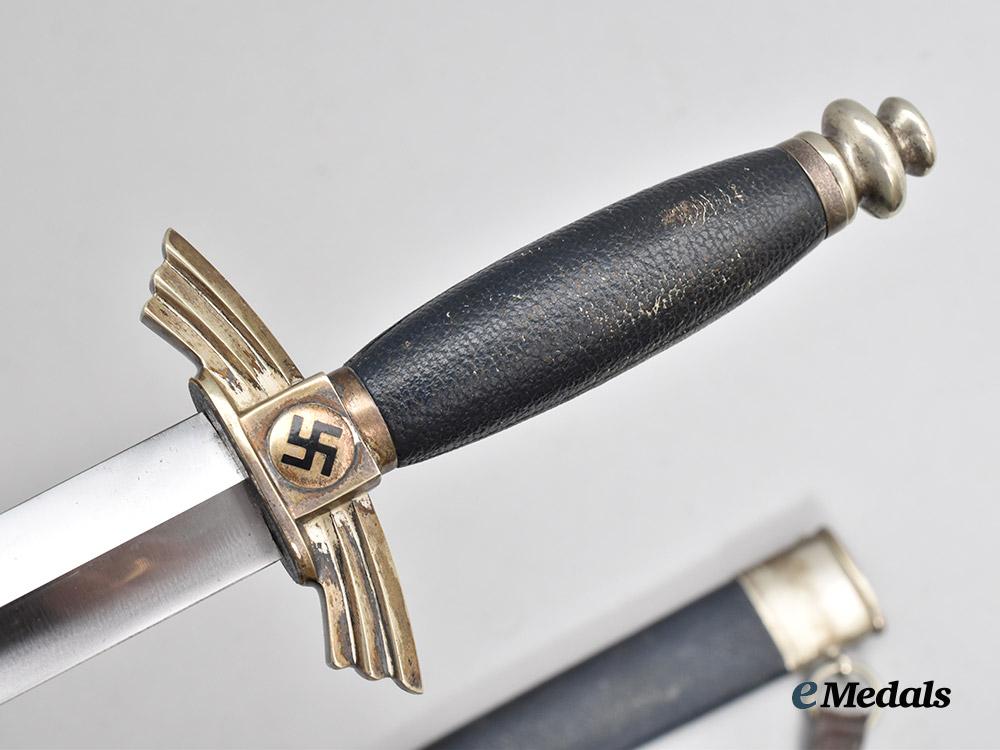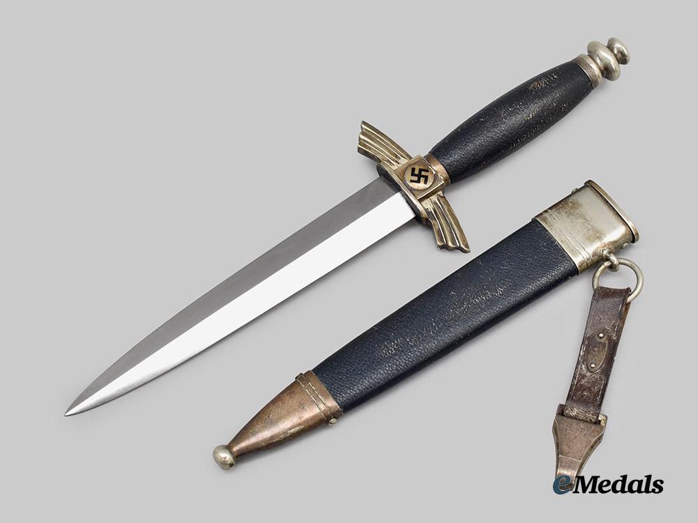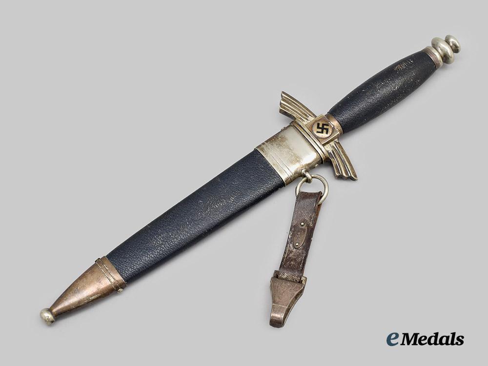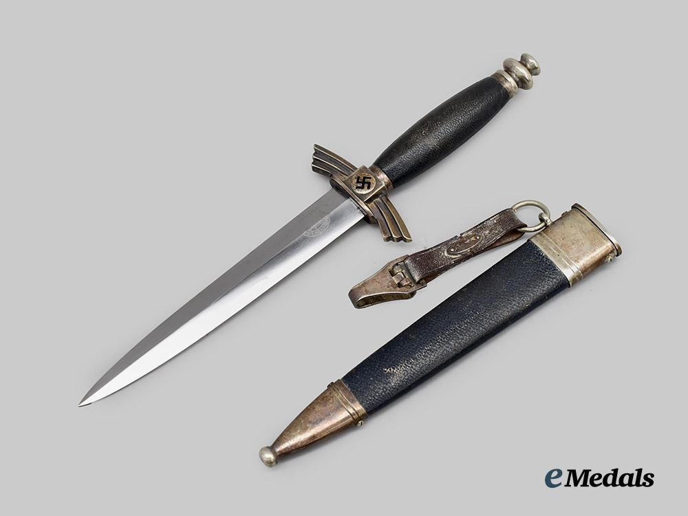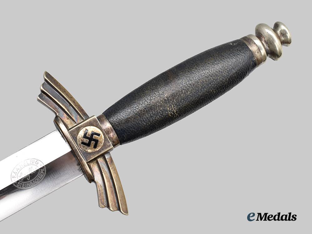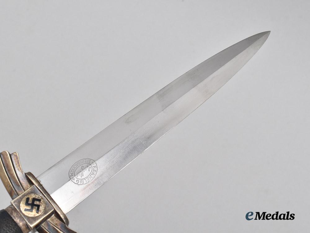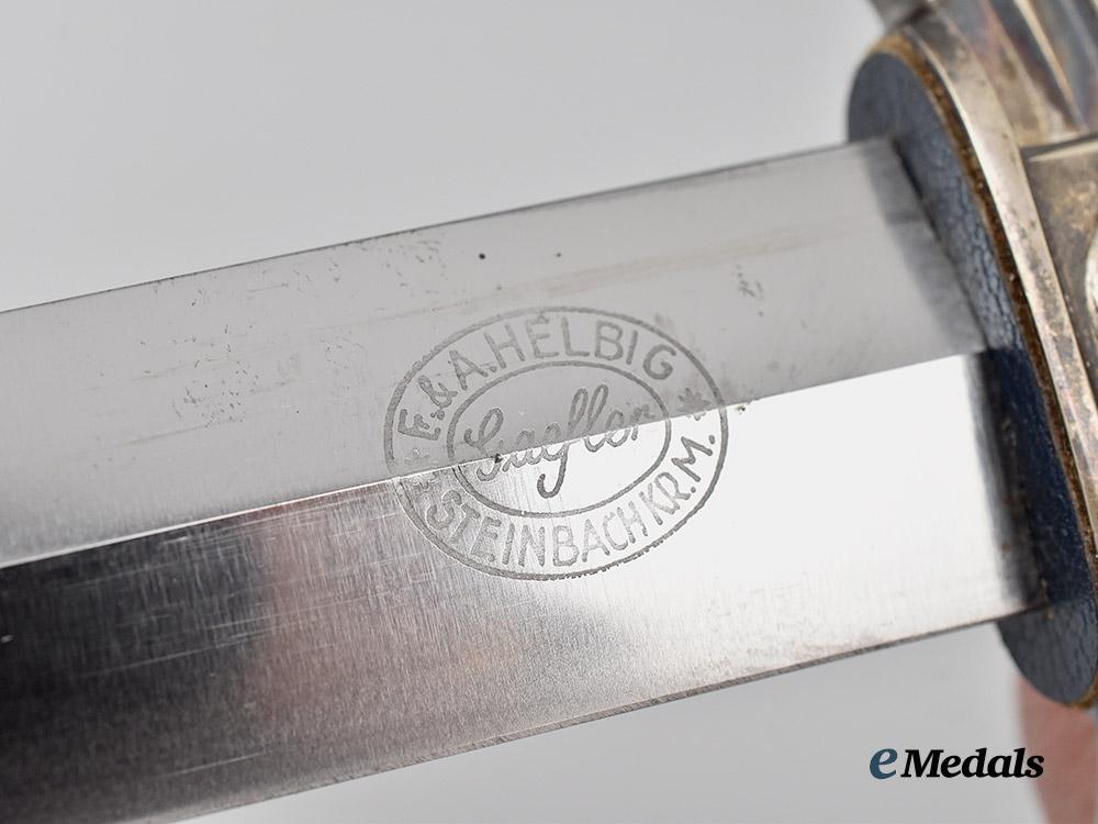 (Deutscher Luftsportverband Fliegermesser). An extremely well-preserved Deutscher Luftsportverband (German Air Sports Association/DLV) Flyer’s Knife, measuring 34 cm in total length when inserted into the scabbard. It features a 17 cm-long, nickel-plated, magnetic steel blade which retains factory-original sharpening to both the edges and tip. Acid-etched onto the reverse ricasso is a maker’s mark of “F. & A. HELBIG STEINBACH KR. M.”, circumscribing the firm’s “GAEGLER” trade name which is executed in cursive script. The blade sits securely within a nickel-silver crossguard which takes the form of a pair of stylized wings, in turn bearing double-sided central black mobile swastika, with an intact dark blue Moroccan leather buffer pad covering the seam. The handle consists of a wooden core with a gentle curvature, fully lined with a dark blue Moroccan leather grip. It completes with a rounded nickel-silver pommel which screws into the tang to maintain the knife’s structural integrity. Accompanying the knife is its original scabbard, constructed of a magnetic metal shaft lined on the exterior with dark blue Moroccan leather. Nickel-silver fixtures are secured to both the tip and throat with side rivets. Emanating from the latter is a loop for the accommodation of a hanger, itself constructed of a brown leather strap connecting to a functional nickel-silver spring clip for uniform attachment. Stamped onto the throat is a DLV insignia, while a functional catch situated within the interior firmly holds the knife in place during storage. Minor issues consistent with age and wear are evident, and include faint running marks to the blade, a consistent patina throughout the nickel-silver fixtures, and minor material fatigue to the leather elements. This rare and untouched example remains in an extremely fine condition.