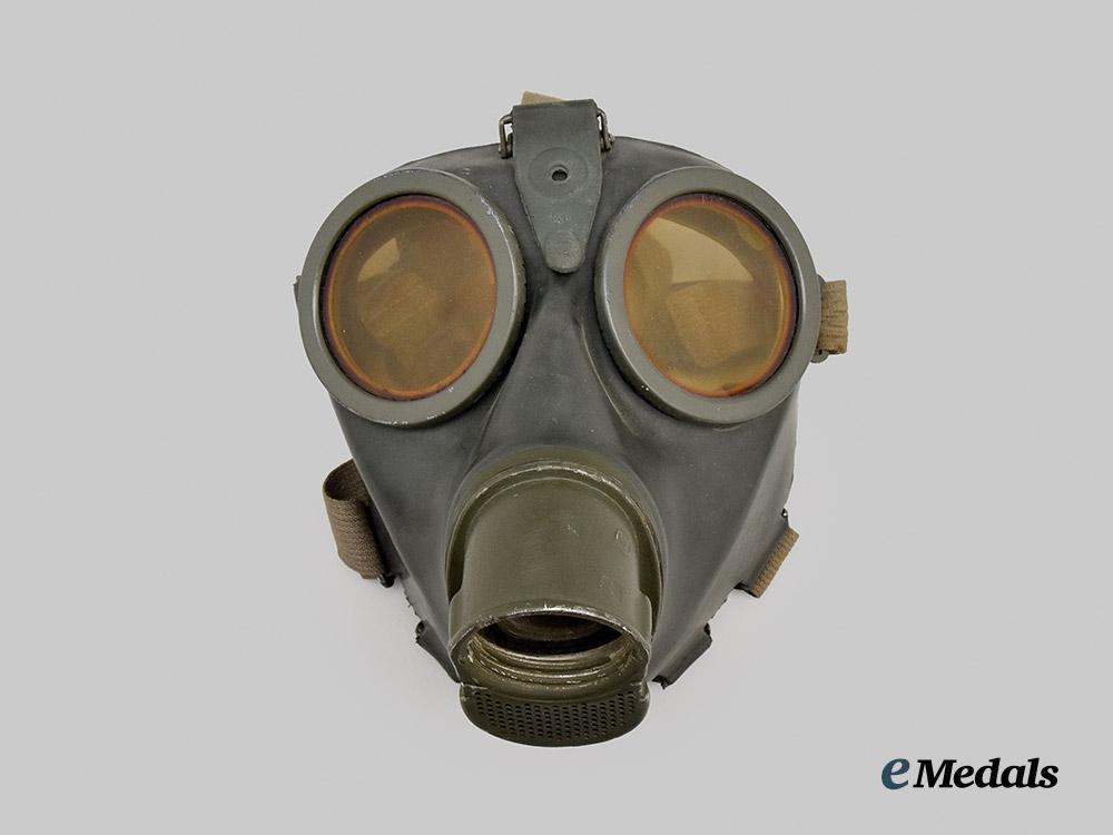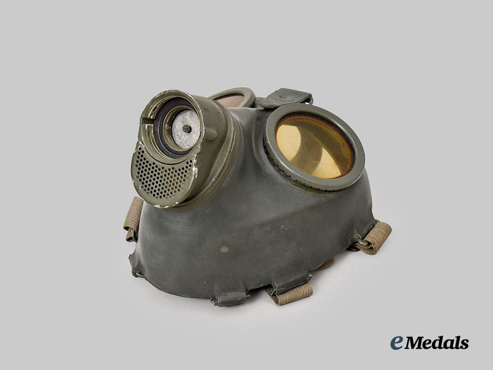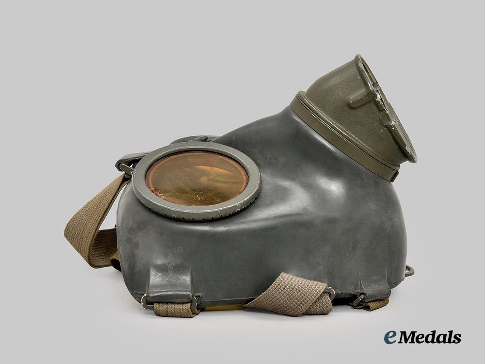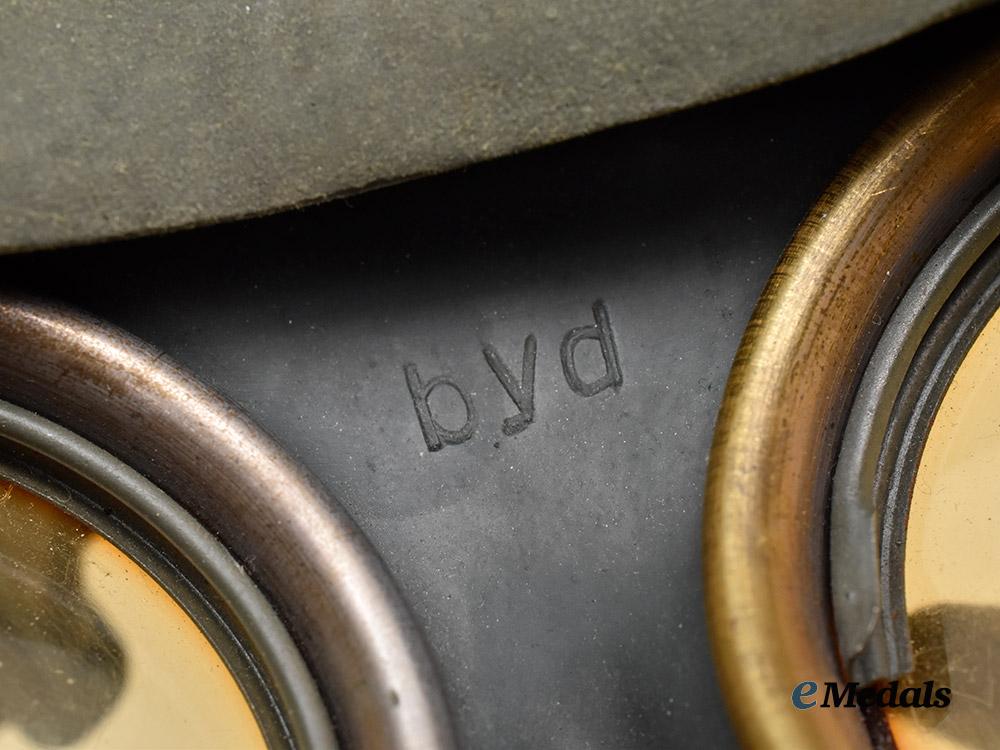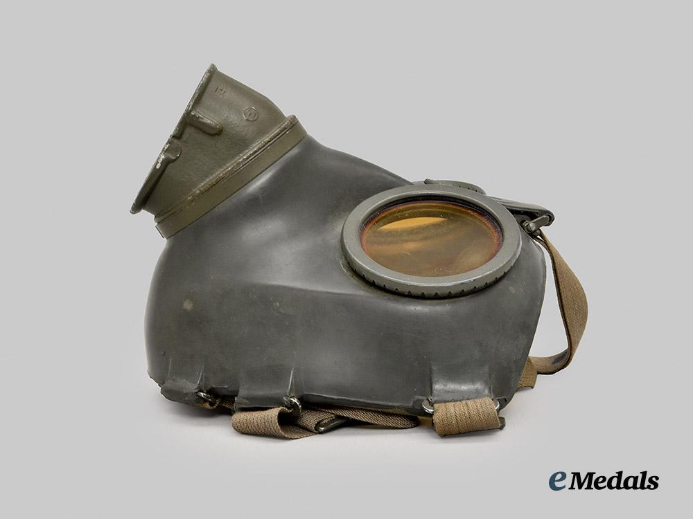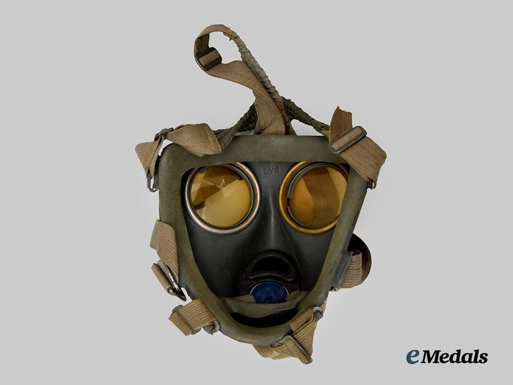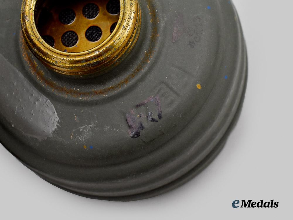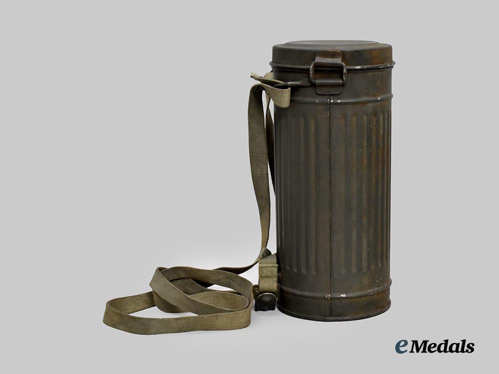 (Heer Gasmaske M38 mit Tornister). A mint Heer M38 gas mask, constructed of a field-grey rubber frame, the face featuring eyepieces consisting of yellow tinted celluloid lenses situated within circular magnetic metal rings, with the rim surrounded by aluminum loops accommodating original and fully-intact grey cotton straps adjusted with functional aluminum buckles, the front featuring a field-grey painted aluminum ventilation shaft with interior threading for the accommodation of a corresponding filter, the latter included and constructed of a field-grey painted magnetic metal shell, the mask maker marked on both the shell and lenses with code “BYD” for Drägerwerk AG, Lübeck, with a manufacture date of “42”, and with an additional Waffenamt stamp visible on the filter, accompanied by a matching canister, constructed of field-grey painted magnetic metal, the exterior featuring a ribbed shell and with two protruding loops accommodation an original canvas carrying strap, topped by a lid on a functioning hinge which fasten closed with an additional spring-loaded strap, opening to reveal a hidden compartment within the lid which retains unused replacement lenses within an original wax paper package, measuring 13 cm (w) x 28 cm (h), demonstrating no signs of wear or fatigue to either the mask or canister, a superb and unused mid-war example in near mint condition.