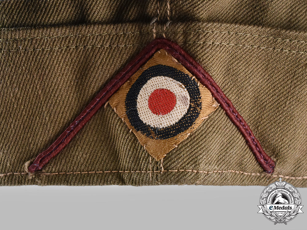 (Heer Nebeltruppe Schiffchen). An extremely well-preserved Heer Smoke Troops EM/NCO’s overseas cap, constructed of olive-grab cotton twill. The cap is fully surrounded by fold-down side paneling, held in place by two pieces of stitching at the front. It is flanked on each side by ventilation holes reinforced by brown-painted zink eyelets. Stitched into the peak of the cap is an insignia in the form of a silver-grey cotton threaded Wehrmacht eagle clutching a wreath mobile swastika on a light brown backer, measuring 70 mm (w) x 28 mm (h).
