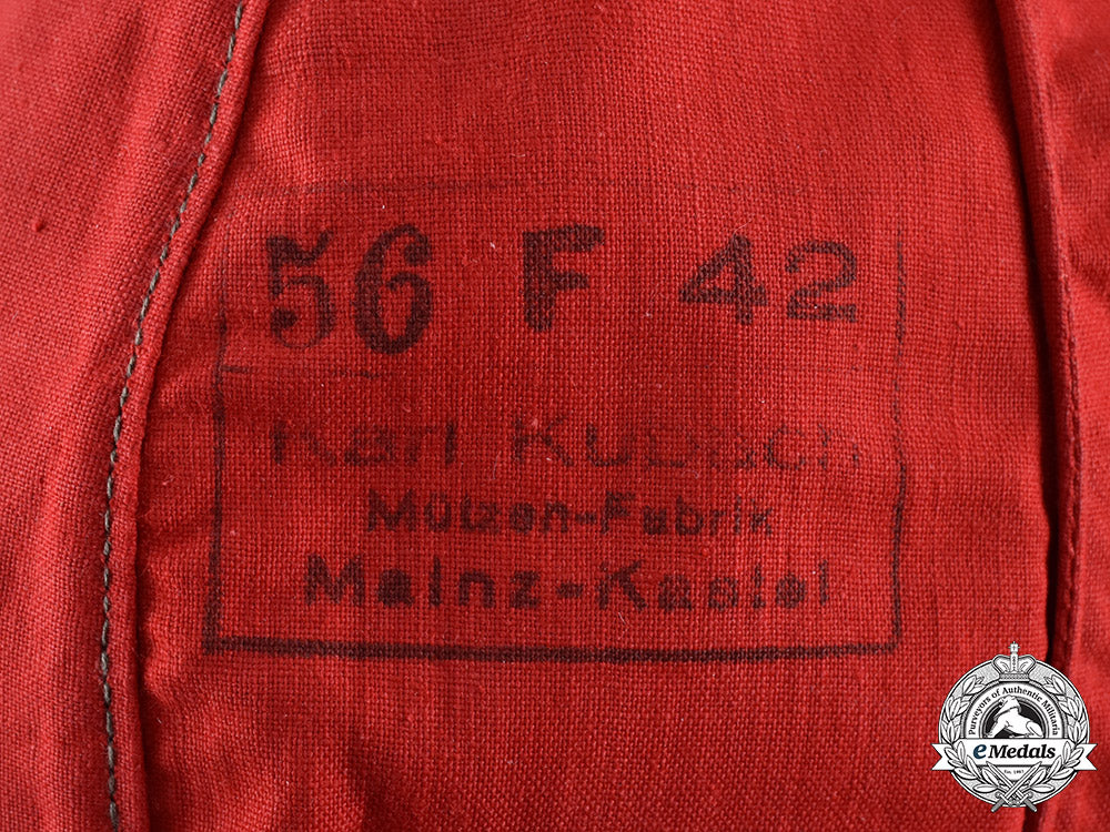 Beneath the eagle is a purple soutache, affixed to the cap by stitching on the exterior and looped through holes visible on the reverse of the paneling. The soutache surrounds a tri-colour embroidered cotton cockade, similarly on a light brown background and measuring 38 mm (w) x 34 mm (h). The interior of the cap features a complete red cotton liner secured in place with multiple rows of machine stitching. The crown is stamped with a black ink maker’s mark reading “KARL KUBACH, MÜTZEN-FABRIK, MAINZ-KASTEL”, with a size of “56” and a manufacture year of “42”. The cap measures approximately 285 mm (l) x 110 mm (h). Minor material fatigue is evident, but it is in an overall extremely fine condition.