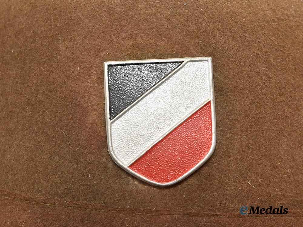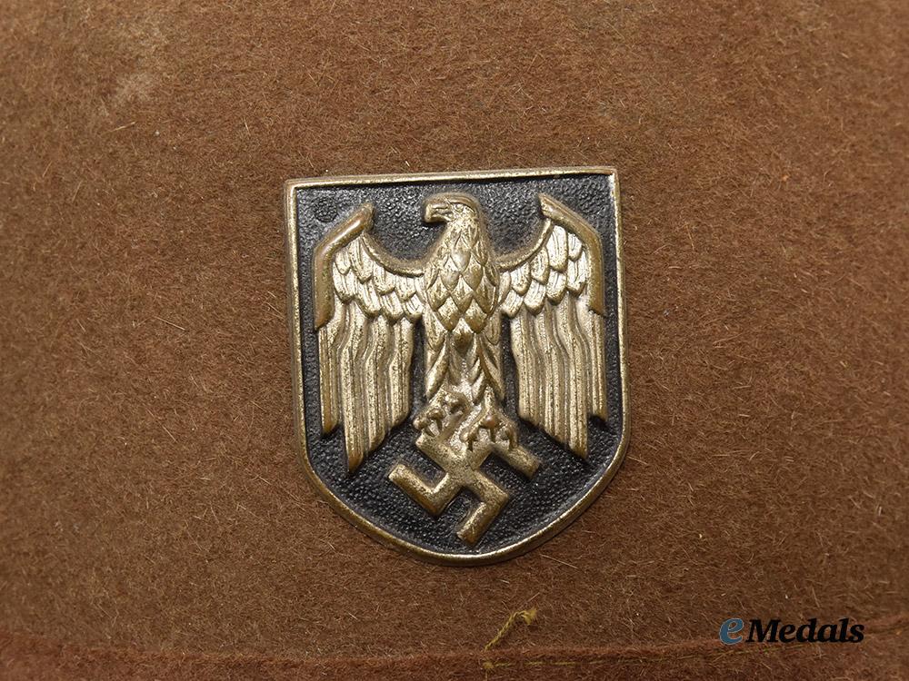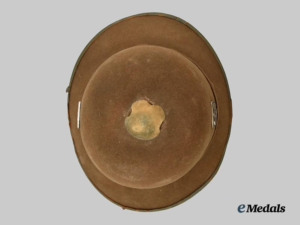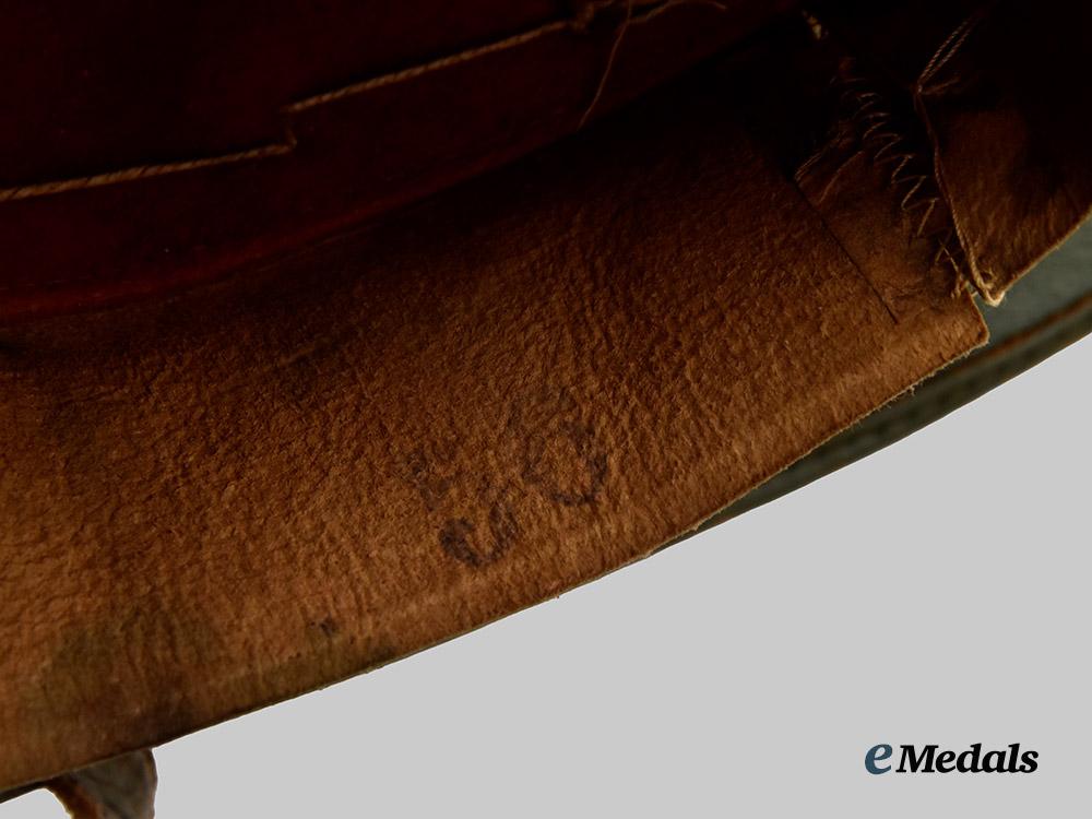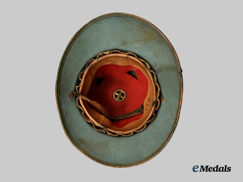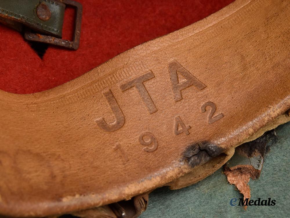 (Heer Tropenhelm, 2. Form). A second pattern Heer tropical pith helmet, constructed of a pressed cork shell which is fully lined on the exterior with olive-drab felt. It features a central canister topped on the crown by a ventilation shaft hidden by a dome lined in identical felt. The canister is flanked by insignia constructed of aluminum and bronze alloy, with the aluminum right side featuring a red, white (substituted with silver base metal), and black Wehrmacht tri-colour, and the alloy left side shield consisting of a black shield bearing a raised and silvered Heer-style German national eagle clutching a mobile swastika. Each insignia measures 35 mm (w) x 42 mm (h). A band of olive-drab felt surrounds the lower edge of the canister where it meets a wide brim, itself trimmed along the outer edge with olive-drab leather. The interior of the canister is fully encompassed by a dark green cotton liner, and features a scalloped ring which accommodates a light brown leather sweatband. The left side of the rim retains a magnetic metal hook which accommodates a partially-intact slate-grey leather sweatband, with the opposite end lost to time. It completes with a red felt crown which is topped by a brass ventilation fixture. The sweatband is stamped with a maker’s mark of “JTA” for a documented but unidentified manufacturer of Wehrmacht tropical headgear, along with a manufacture date of “1942”. It measures 28 cm (w) x 34 cm (l) x 19 cm (h). Issues consistent with age and field use are evident, and include minor material fatigue throughout the exterior felt liner, some flattening of the crown, fatigue of the rim liner, and partial loss of the chinstrap. This mid-war example remains in a better than very fine condition.