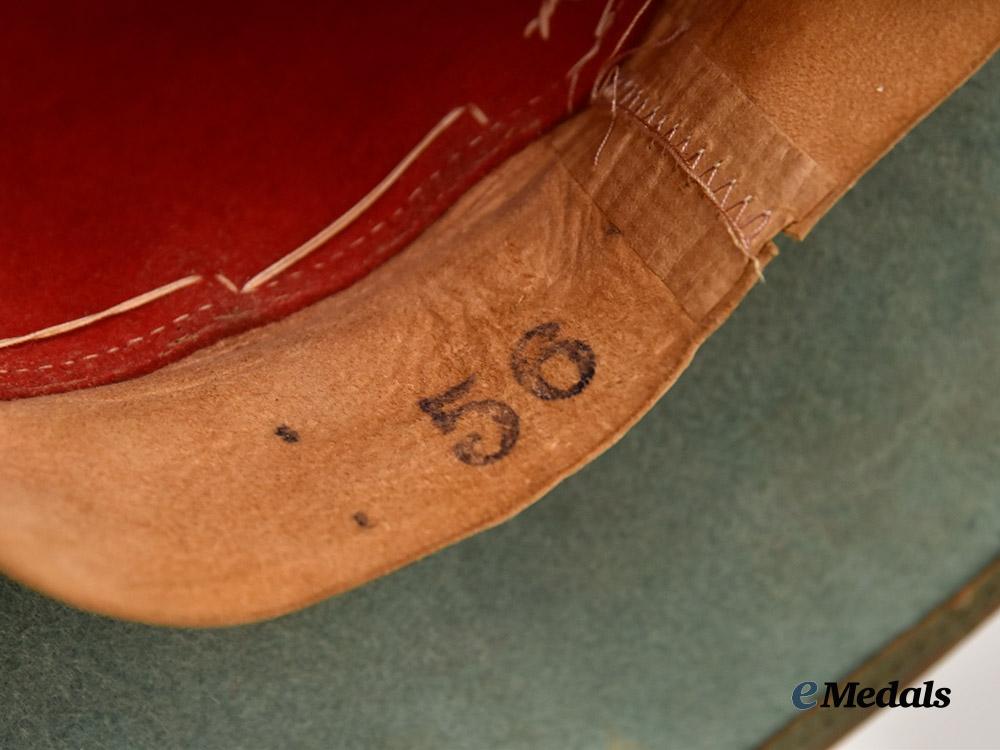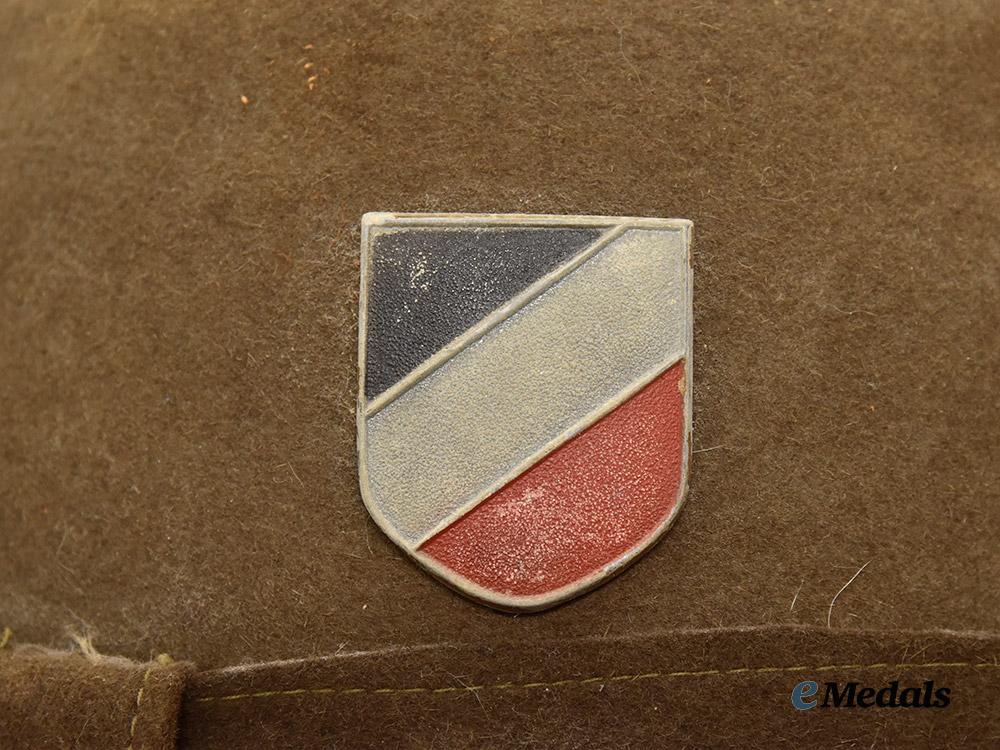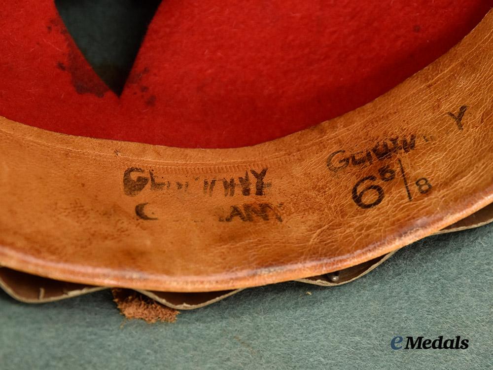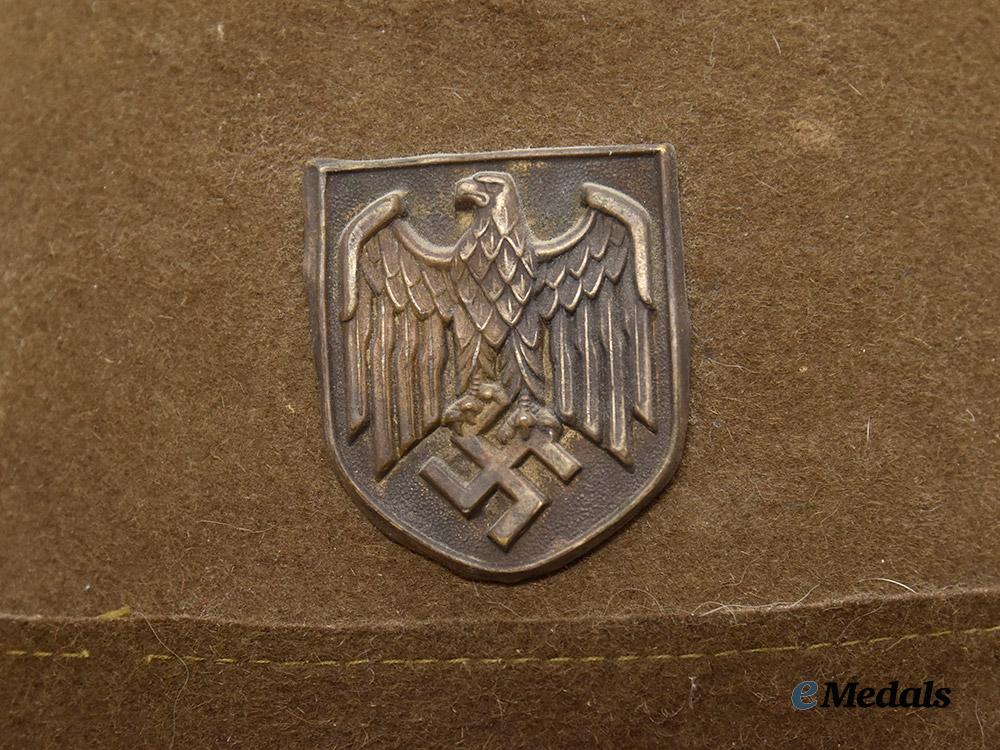 (Heer Tropenhelm, 2. Form). A second pattern Heer tropical pith helmet, constructed of a pressed cork shell which is fully lined on the exterior with olive-drab felt. It features a central canister topped on the crown by a ventilation shaft hidden by a dome lined in identical felt. The canister is flanked by insignia constructed of zink, with the right side featuring a red, white (substituted with silver base metal), and black Wehrmacht tri-colour, and the alloy left side shield consisting of a black shield bearing a raised and silvered Heer-style German national eagle clutching a mobile swastika. Each insignia measures 35 mm (w) x 42 mm (h). A band of olive-drab felt surrounds the lower edge of the canister where it meets a wide brim, itself trimmed along the outer edge with olive-drab leather. The interior of the canister is fully encompassed by a dark green cotton liner, and features a scalloped ring which accommodates a light brown leather sweatband. The left side of the rim retains a magnetic metal hook which accommodates a partially-intact slate-grey leather sweatband, with the opposite end lost to time. It completes with a red felt crown which is topped by a brass ventilation fixture. The sweatband is stamped with a maker’s mark of “JTA” for a documented but unidentified manufacturer of Wehrmacht tropical headgear, along with a manufacture date of “1942”. The reverse is stamped with a size mark of “56”. Additional illegible stamped and handwritten marks are visible on the obverse of the sweatband, some of which appear to read “GERMANY”, possibly indicating a veteran souvenir or post-war use as a film prop. It measures 28 cm (w) x 34 cm (l) x 19 cm (h). Issues consistent with age and field use are evident, and include replacement of the crown dome, replacement of the canister band, and deterioration of the brim liner. This interesting example remains in a very fine condition.
