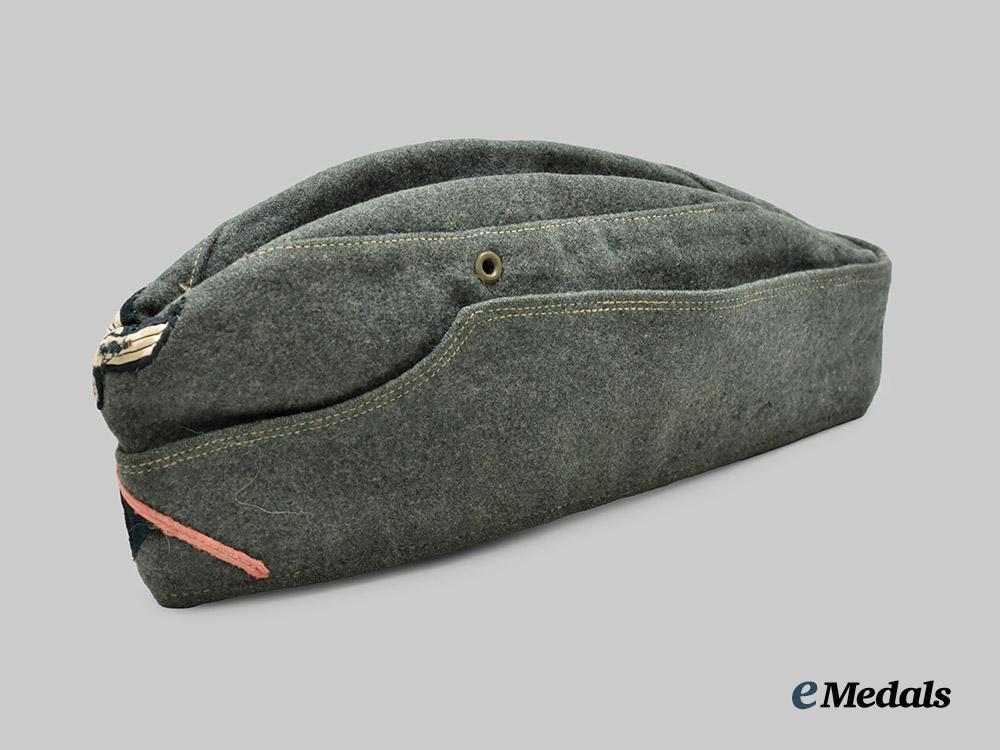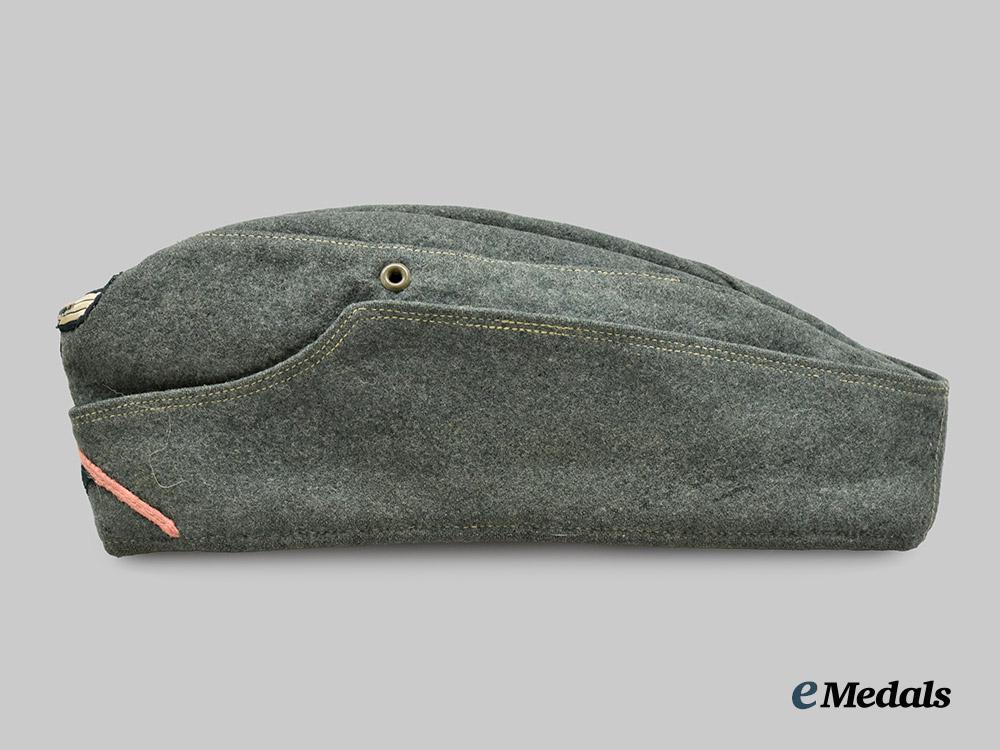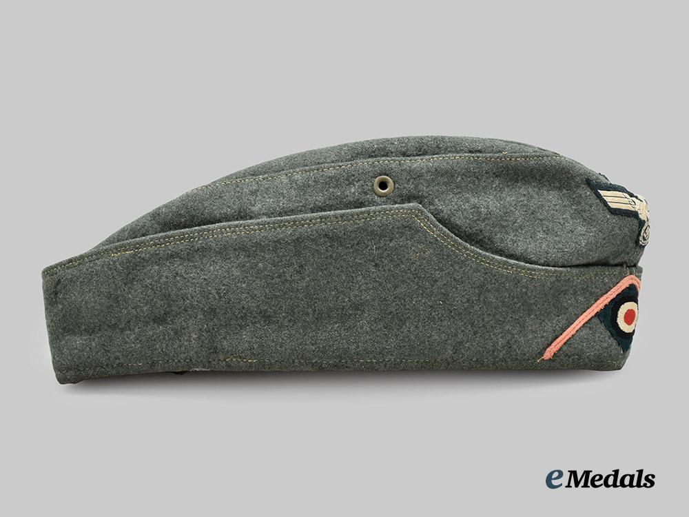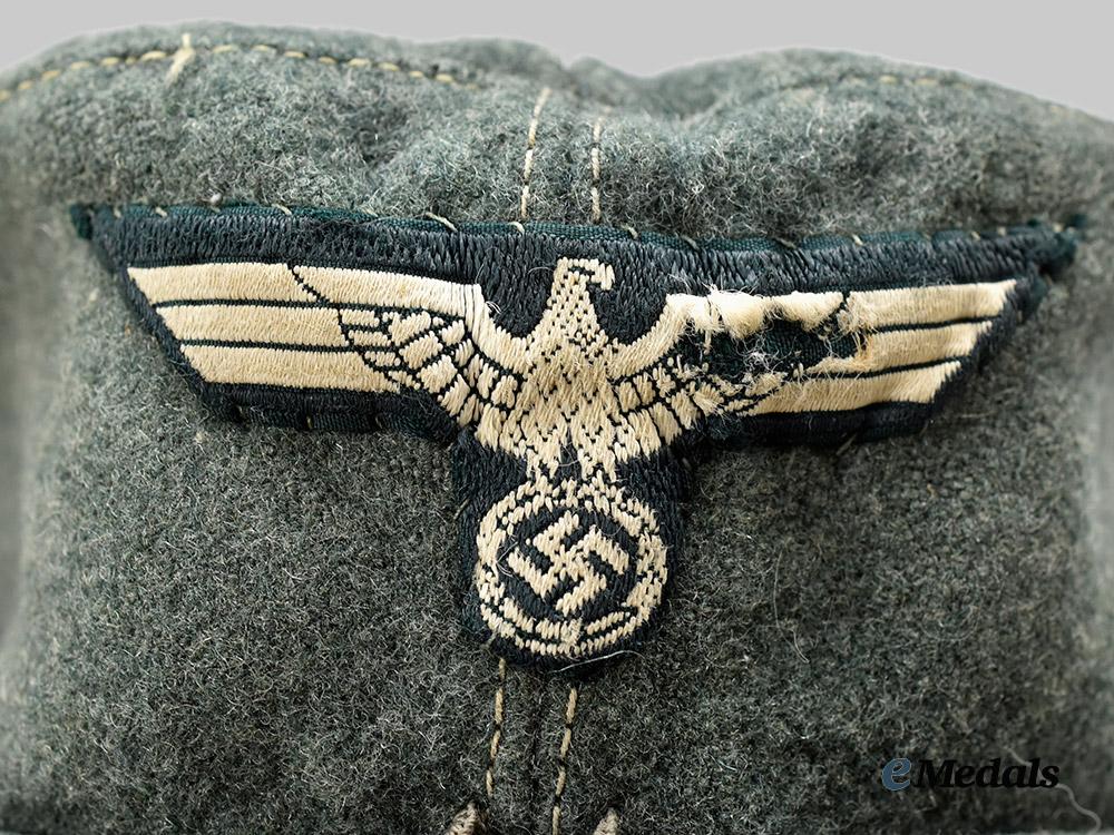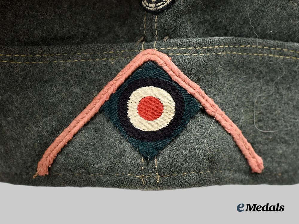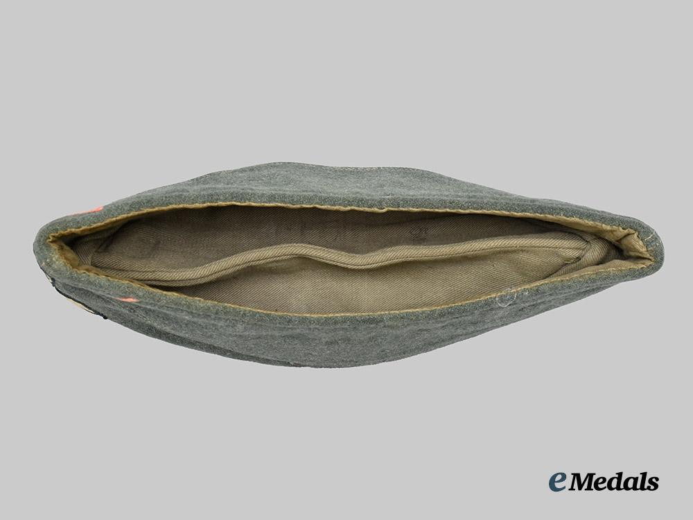 (Heer Schiffchen M35 für Mannschaften der Panzertruppe). A well-preserved Heer Armoured Enlisted personnel M35 field cap, constructed of field-grey wool. It is fully surrounded by fold-down side walls which scallop toward the front, and which are held in position by a piece of heavy stitching toward the front of each side. The crown is flanked on each side by a ventilation hole reinforced with a grey painted metal grommet. Stitched onto the peak is an insignia consisting of a dark green rayon backer bearing a machine-embroidered silver-grey Wehrmacht eagle clutching a wreathed mobile swastika, measuring 65 mm (w) x 25 mm (h). Directly below the eagle, the centre of the wall features an additional insignia in the form of a dark green rayon backer bearing a machine-embroidered tri-colour cockade, measuring 35 mm (w) x 35 mm (h). The cockade is surrounded by a rose-pink soutache which is securely stitched into the structure of the cap. A multi-piece grey cotton liner fully encompasses the interior, with the crown bearing the illegible remnants of stamped maker and size marks, along with an additional handwritten number “5”. The cap measures approximately 28 cm (l) x 11 cm (h) when folded on a flat surface. Moderate material fatigue is visible to the eagle, significant wear consistent with field use and clearing is evident to the exterior wool and contrasts with the unspoiled material beneath the walls, and the interior liner demonstrates some soiling and fatigue. The cap remains in an overall very fine condition.