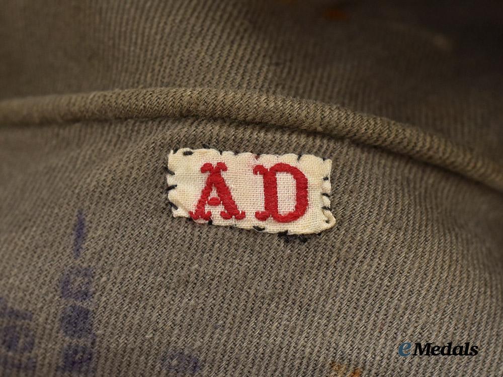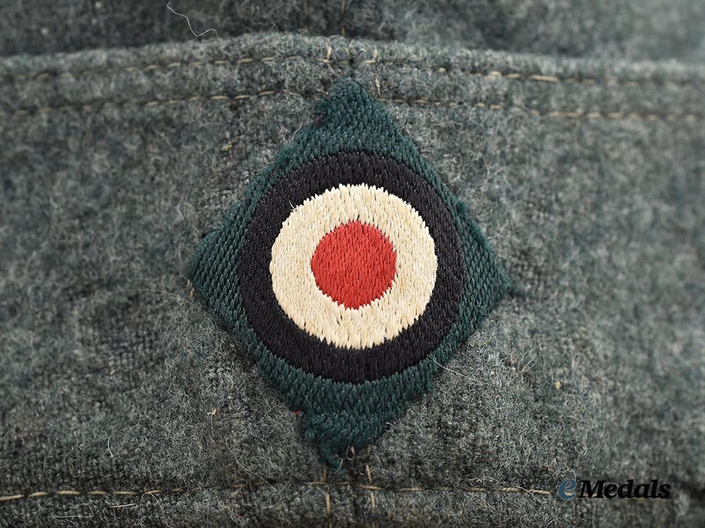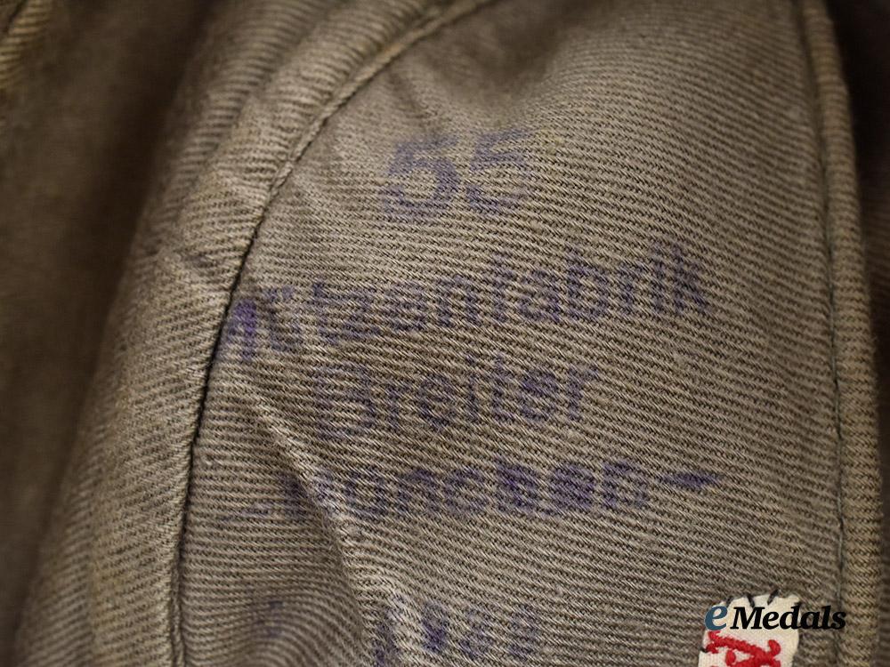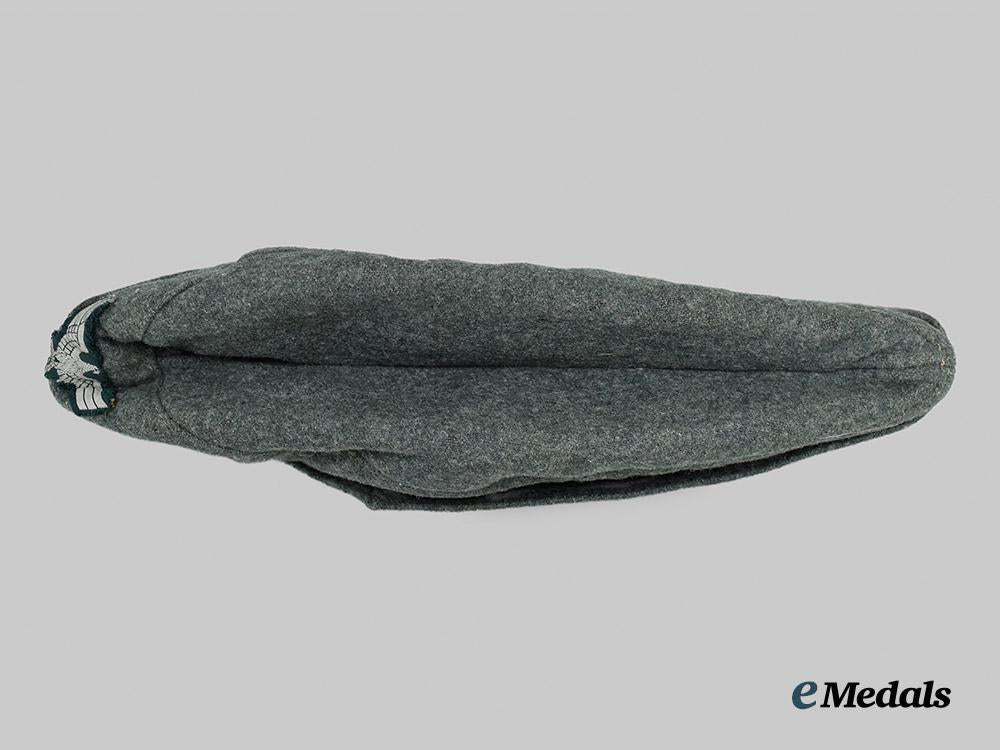 (Heer Schiffchen M35 für Mannschaften). A well-preserved Heer EM/NCO’s M45 overseas cap, constructed of field-grey wool. It is fully surrounded by fold-down side walls which are scalloped toward the front. The crown is flanked by ventilation holes reinforced with zink grommets. Stitched onto the peak is an insignia consisting of a dark green rayon backer bearing a machine-embroidered silver-grey Wehrmacht eagle clutching a wreathed mobile swastika, measuring 60 mm (w) x 30 mm (h). Directly below the eagle, the front features an additional insignia consisting of a dark green rayon backer bearing a machine-embroidered tri-colour cockade, measuring 35 mm (w) x 35 mm (h). The interior is fully encompassed by a multi-piece slate-grey cotton/rayon blended liner. Stamped onto the crown is a maker’s mark of “MÜTZENFABRIK BREITER, MÜNCHEN” for the firm of Adalbert Breiter, with manufacture date of “1939”, and a size mark of “55”. Also stitched onto the liner is a white cotton tag bearing red embroidered owner’s initials “AD”. Measuring approximately 26.5 cm (l) x 11 cm (h) when folded on a flat surface, it demonstrates minor fatigue to the nap of the wool through the exterior base material, slight fraying of the eagle insignia, and sporadic soiling of the interior liner.